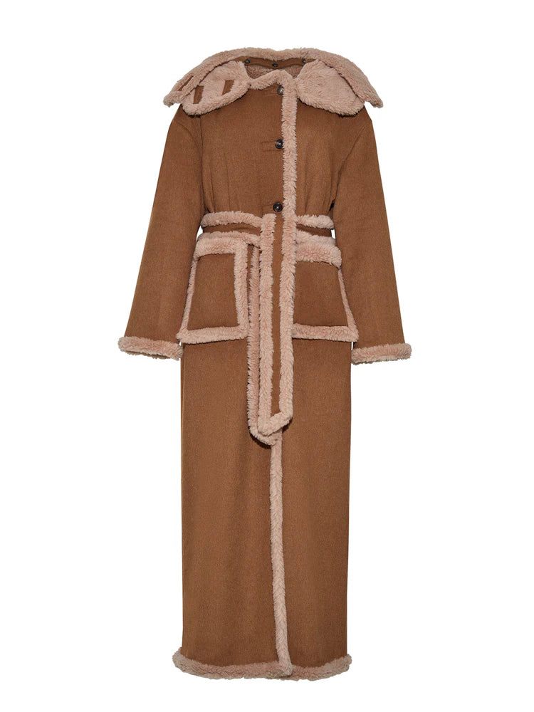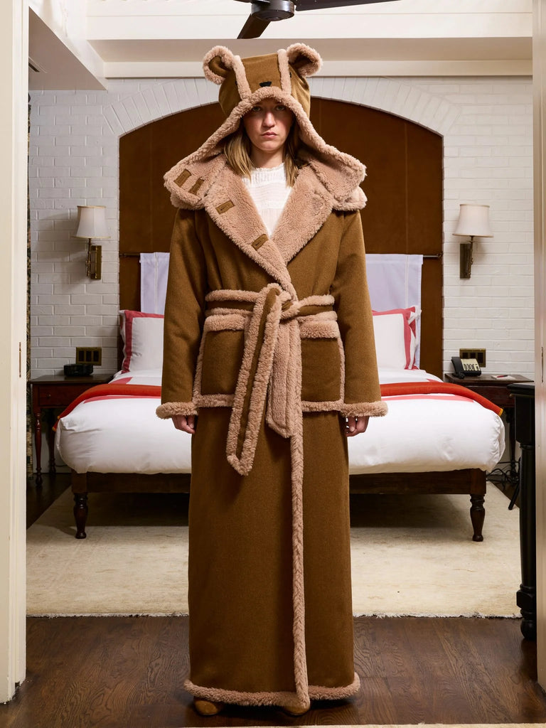 The Bowery Bear coat pays homage to "Bo the Bowery Bear" found in every bed at the Bowery Hotel. This 100% cashmere on outside, faux-shearling on inside, robe coat is designed for maximum coziness with a hint of downtown edge. The oversized silhouette is effortless, while the removable bear hood lets you switch between playful and polished. Featuring “The Bowery Hotel New York City" embroidery on the back, this piece is part statement, part everyday essential.