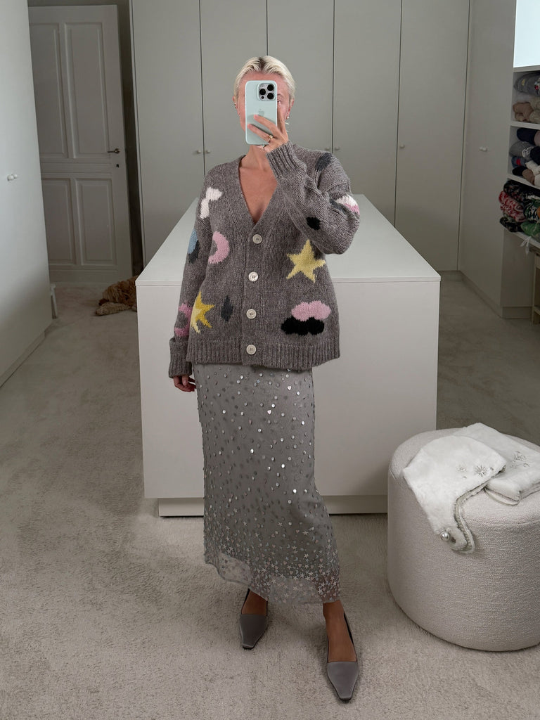 Cardigan Stormy is the knit to live in this season. A loose silhouette in soft beige, patterned with grey melange intarsia that traces weather cycles across its surface. Relaxed yet refined, it brings ease and poetry to everyday dressing—an effortless layer for shifting skies and changing days.
