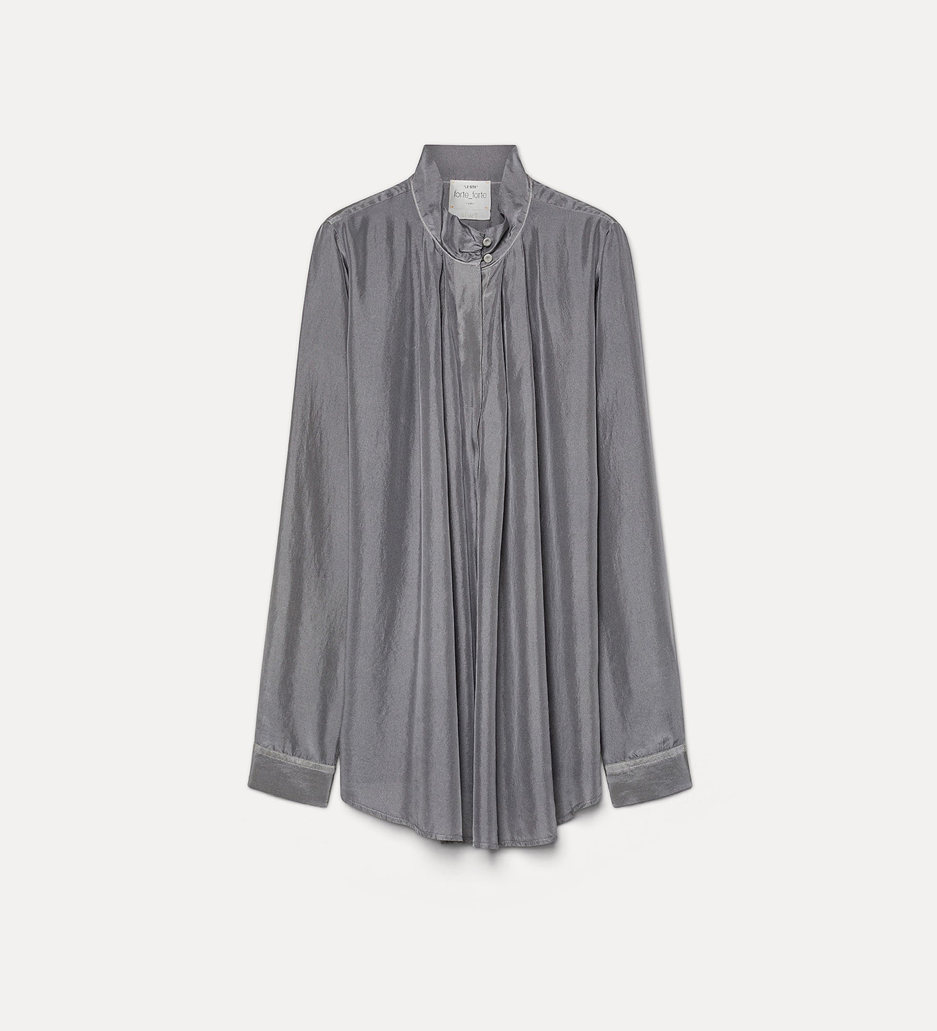 the shirt with a funnel neck in habotai silk is light to the touch and oozes understated elegance. it fastens with buttons positioned slightly asymmetrically for visual interest and has a soft cut at the bodice for a modern silhouette as well as a curved hemline and flowing silhouette.
