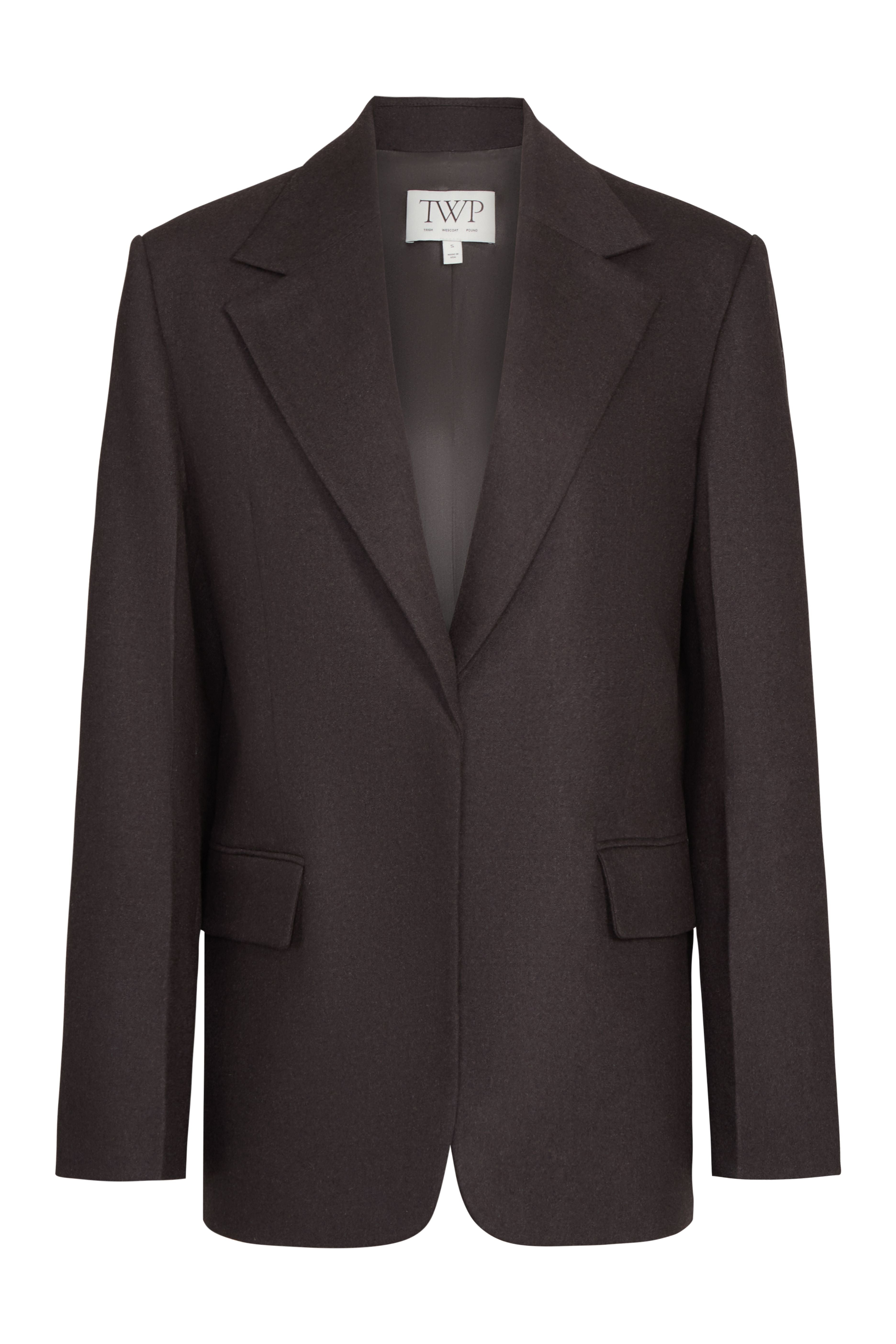 Oversized, single breasted blazer in wool flannel. Tailored with a notched lapel and custom molded shoulder pads. Complete with side flap pockets.