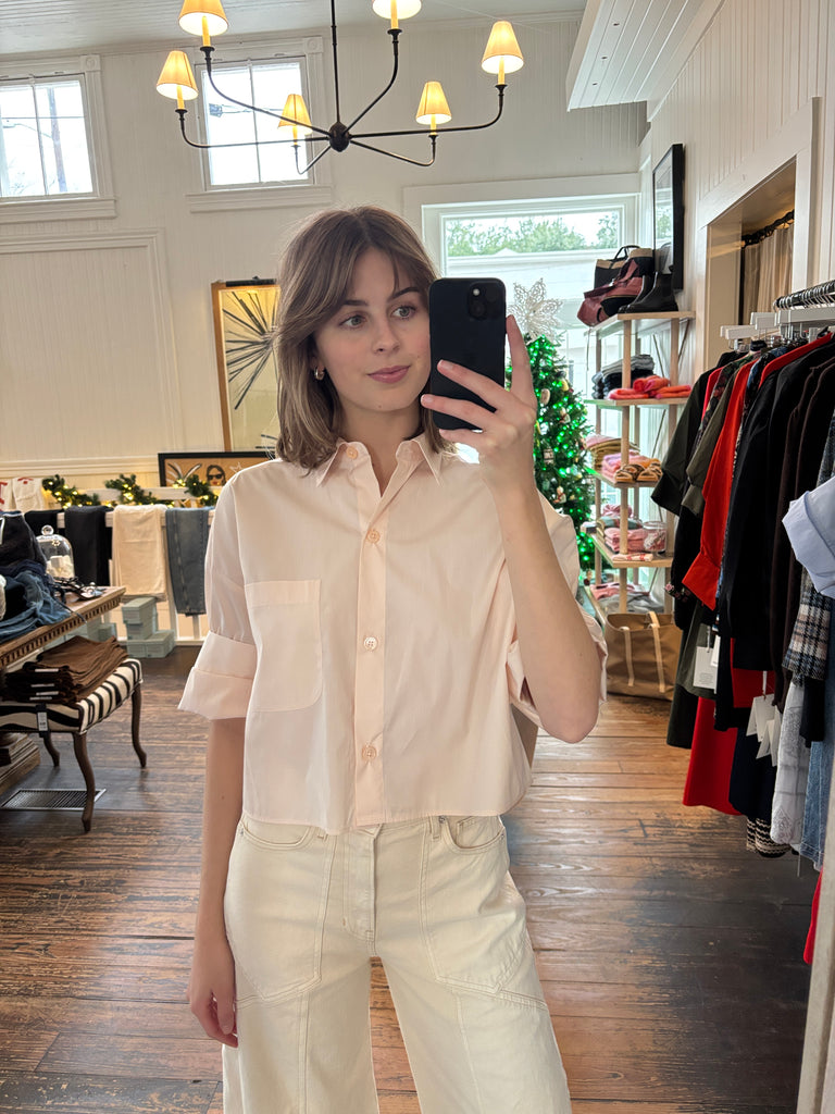 Cropped, short sleeved button down in cotton poplin. Boxy silhouette. Complete with a chest patch pocket, button up placket, spread collar, and our signature double roll button cuffs.