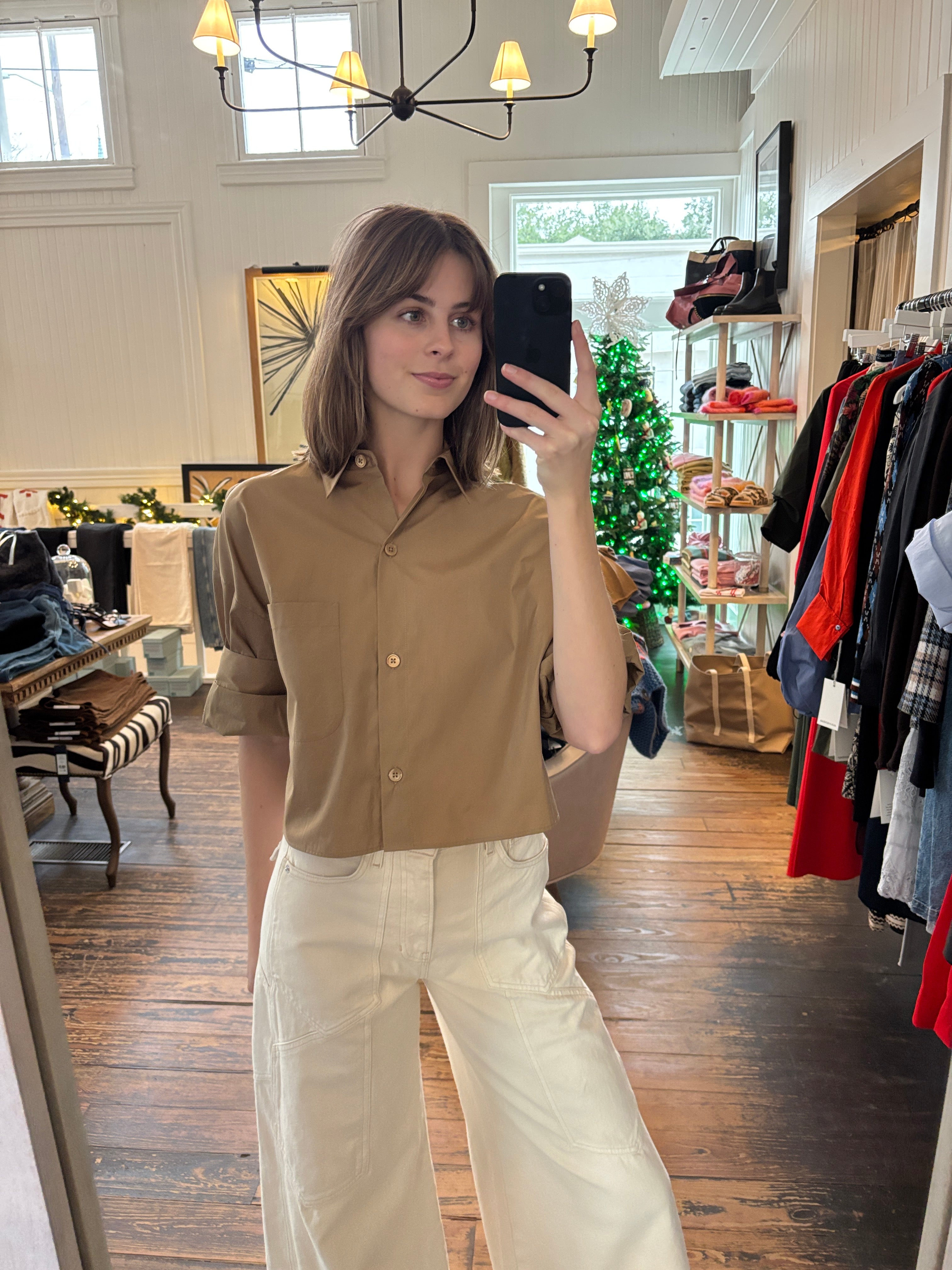 Cropped, short sleeved button down in cotton poplin. Boxy silhouette. Complete with a chest patch pocket, button up placket, spread collar, and our signature double roll button cuffs.