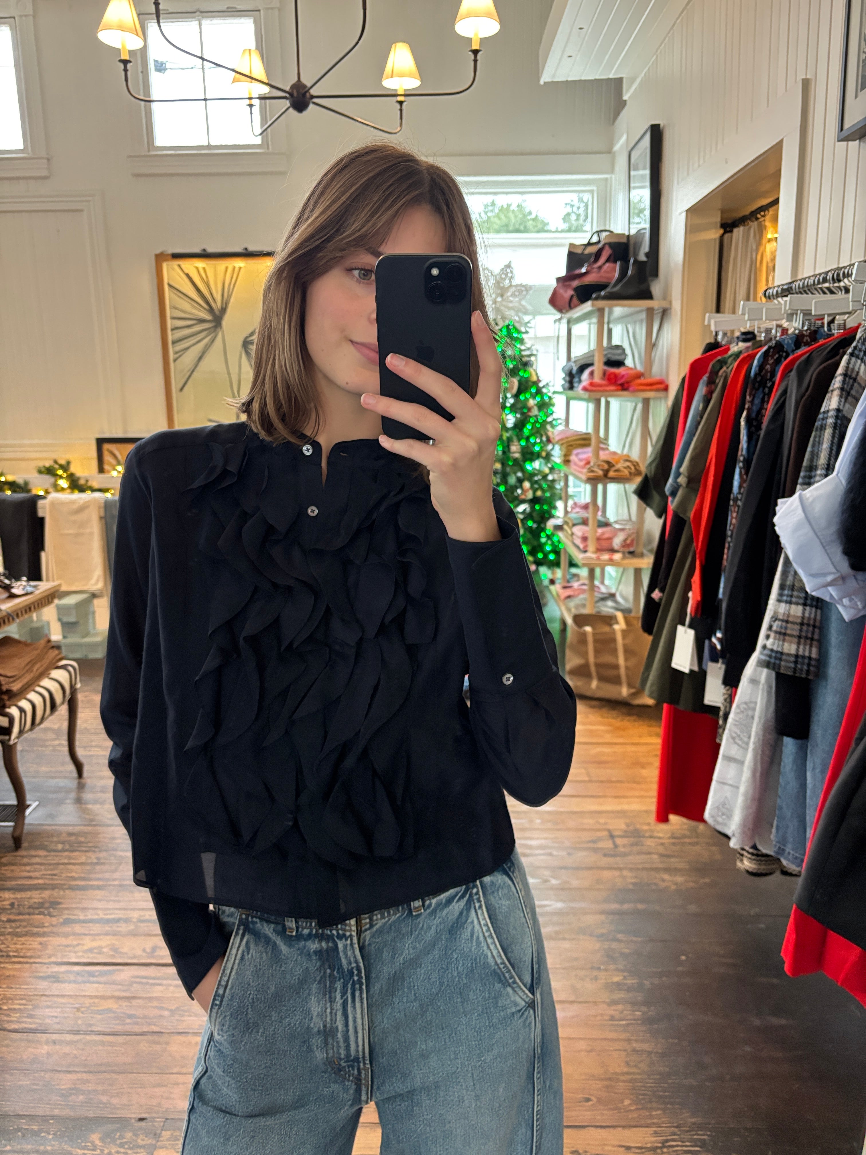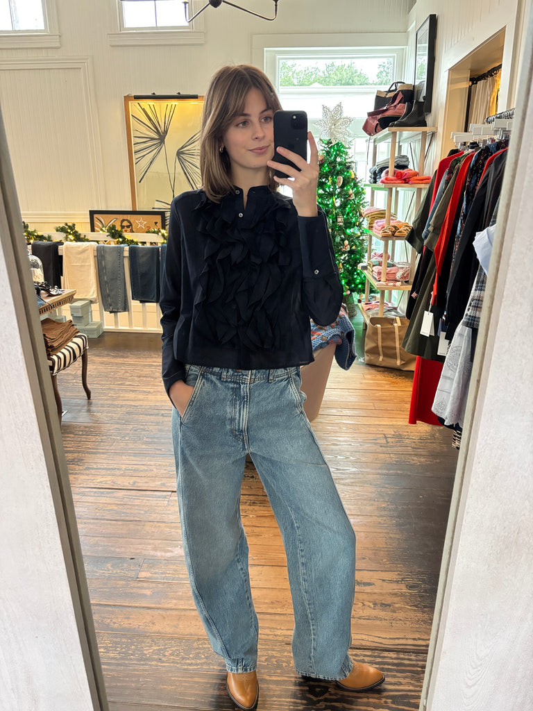 Cropped blouse with neck-tie in Italian cotton shirting. The Patti is slightly fitted at the bust with a playful, ruffled bib. Complete with a concealed button up placket and long single button cuffs.