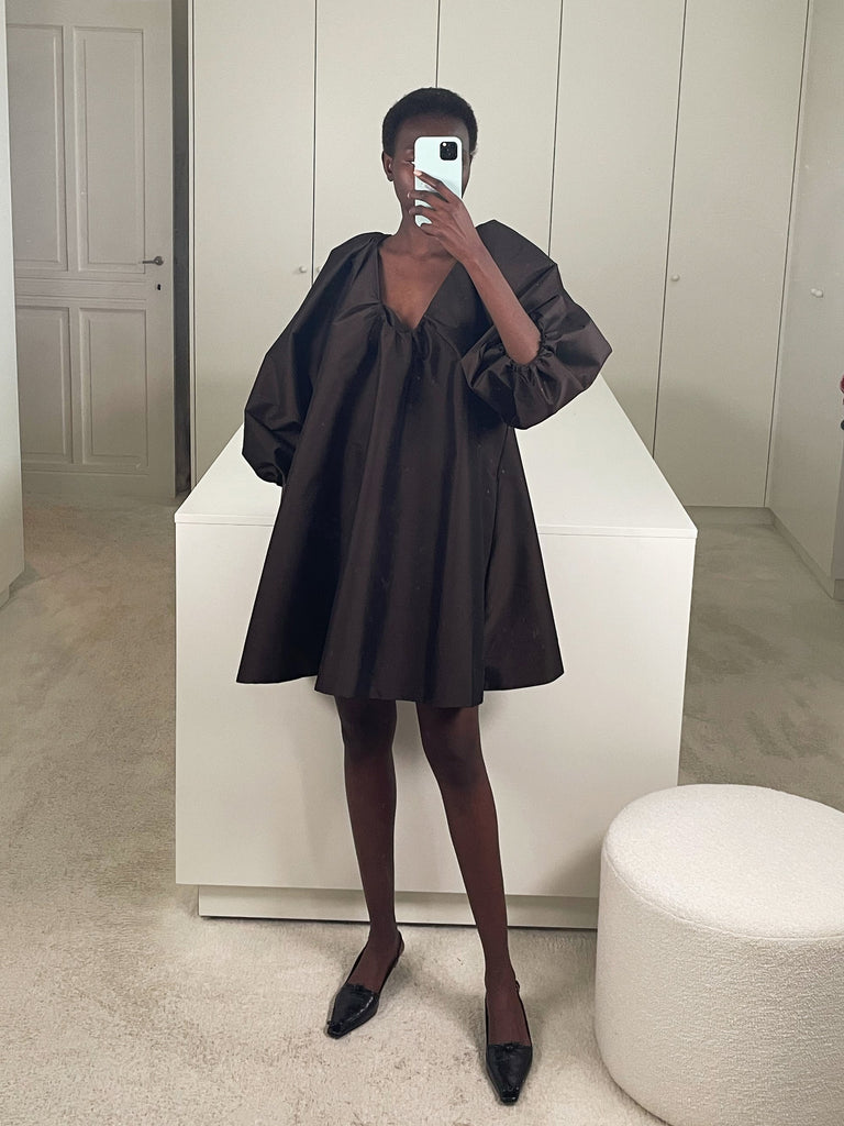 BERNADETTE’s icon, Dress George, reimagined in a shorter length. Cut from our signature taffeta in dark Chocolate Brown, it features a flattering low neck and voluminous puffed sleeves. A playful twist on a timeless statement.