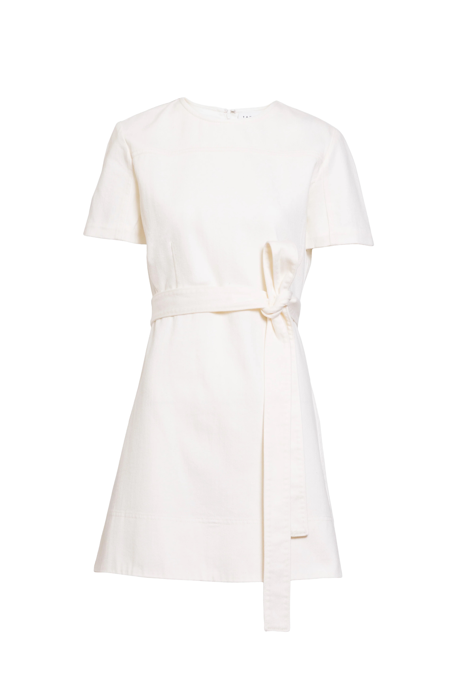Featuring a figure-grazing fit with short sleeves, a self-tie belt, and a flared skirt, Ella's silhouette is approachable with a modern twist.