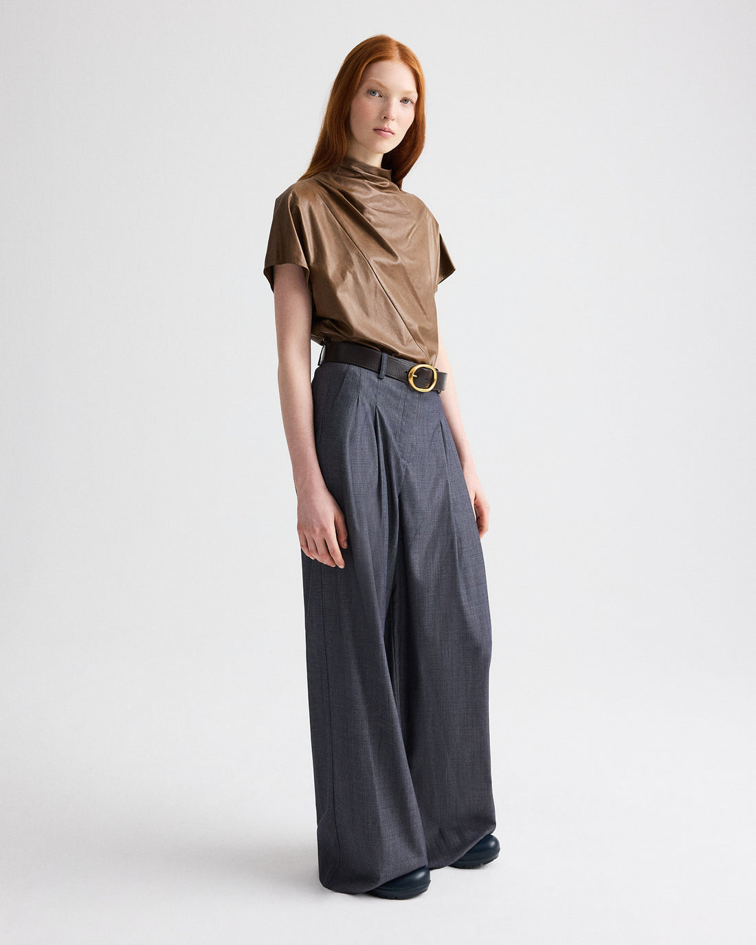 Short-sleeve mock-neck tee crafted in paper leather. Designed with an asymmetric front wrap detail and a relaxed, slightly boxy silhouette. Finished with a refined shoulder button closure, clean-cut sleeves, and subtle back seam detailing.