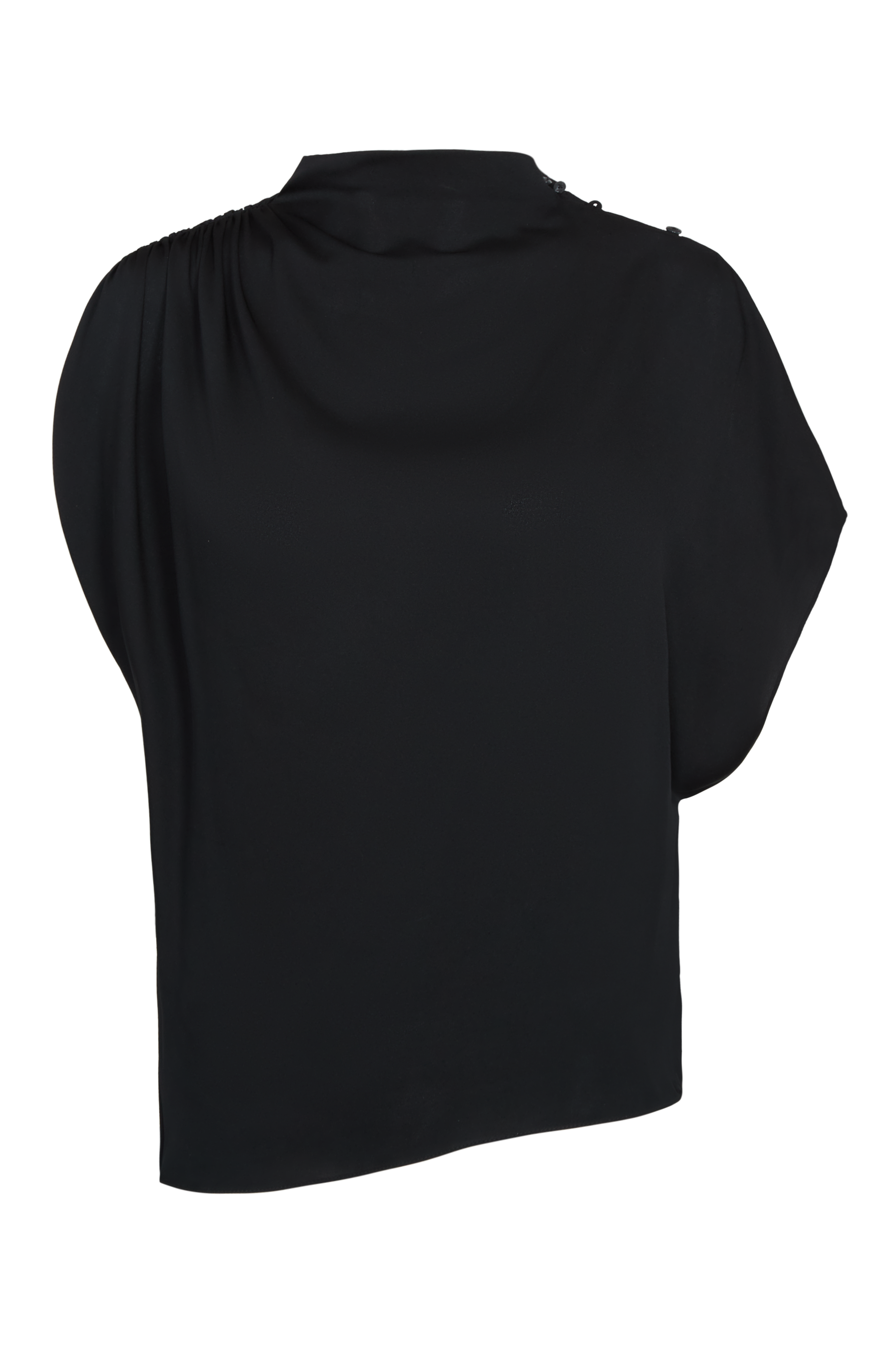 Mock neck, cap sleeved blouse draped in supple lamb leather finished on both sides. Loose fit, with a soft drape that skims the body. Complete with a placket trim on one shoulder and pleats on the other shoulder.