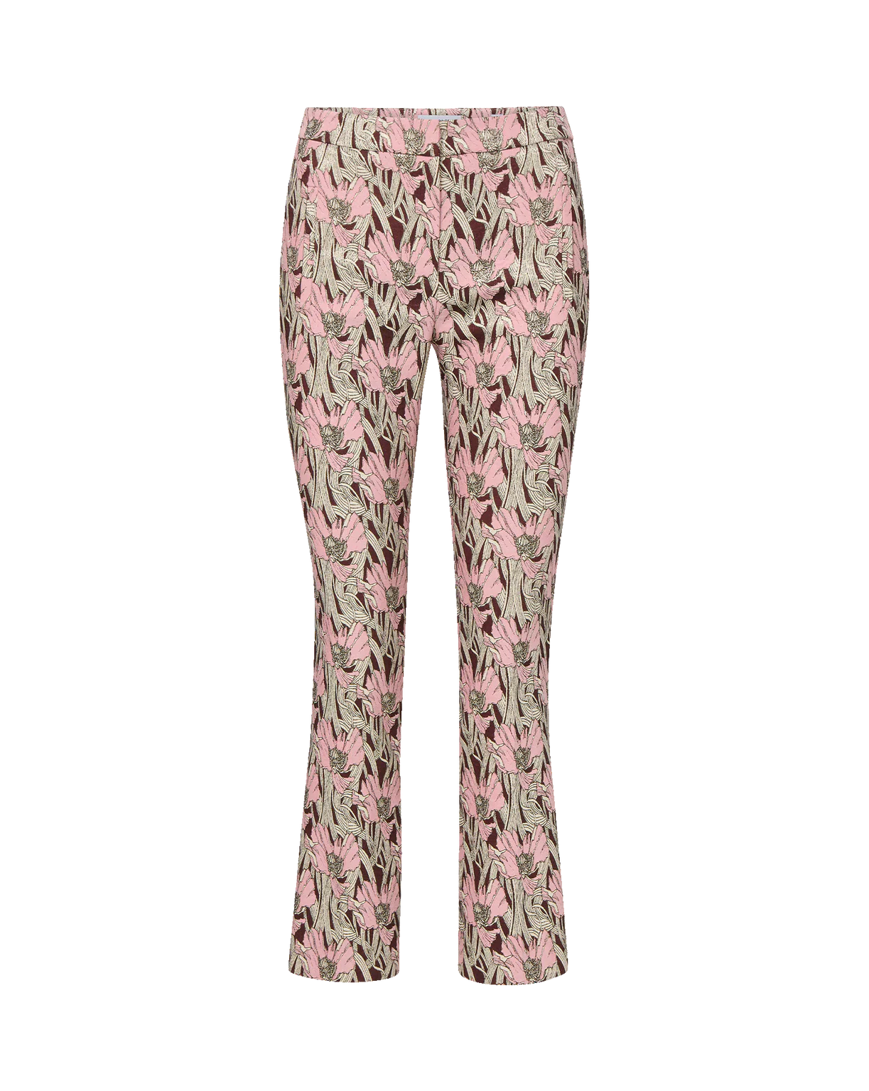 A VB favorite, reimagined in burgundy and pink florals. The Arte pants are cropped and high-waisted with a slim fit and slight flare. Flat welt pockets and a hidden hook-and-bar closure create a sleek, tailored look, while metallic gold threads add a subtle sheen for an elevated finish. Perfect for everyday polish, style it with the coordinating Jessup vest for a matching set or with a cashmere tank top for something more relaxed.
