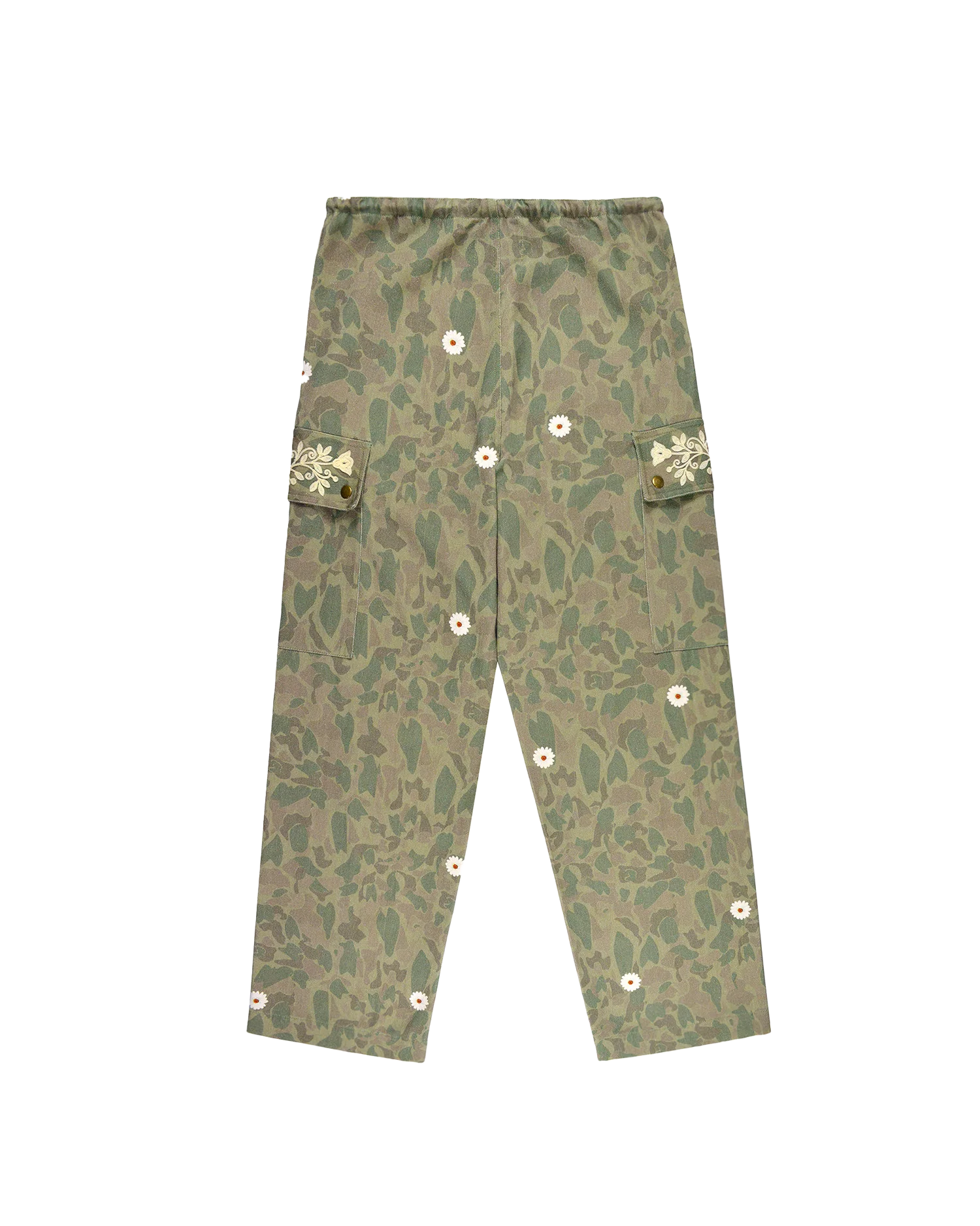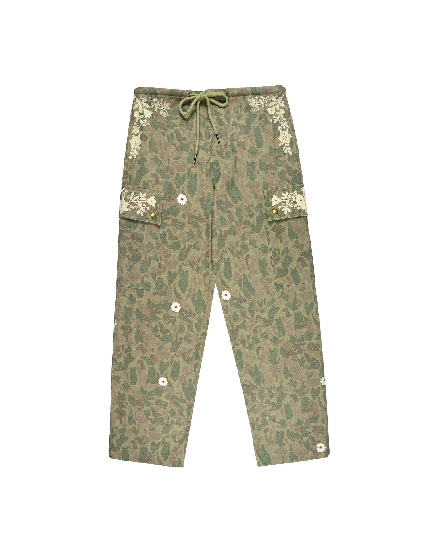 Cotton pants featuring a bold camouflage print, enhanced with delicate daisy embroideries for a subtle contrast. Designed with an adjustable waist and a comfortable fit, these pants offer a unique and versatile look.