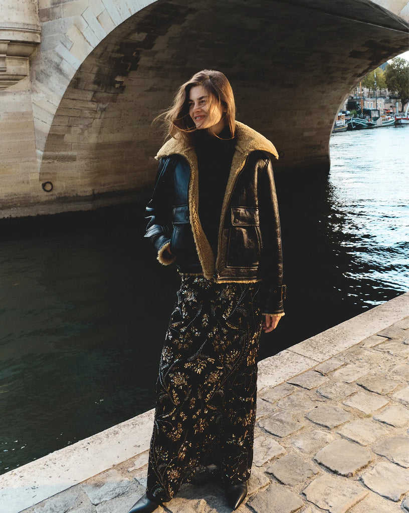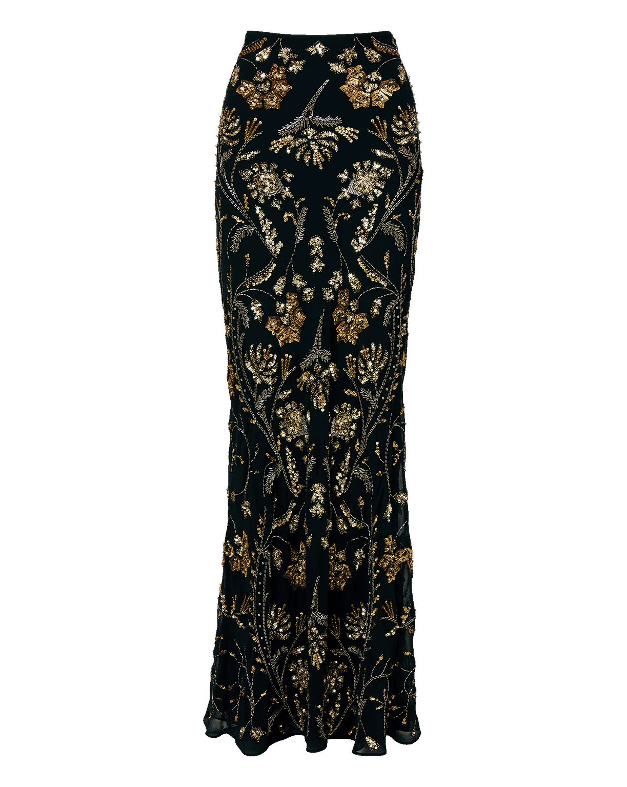 A high-shine take on a '90s-inspired silhouette. Crafted from black sheer georgette, the Medina slip skirt features an intricately embellished gold metallic floral pattern, hand-beaded in India. Cut on the bias for fluid, body-skimming drape, it hugs the hips and falls to a floor-sweeping maxi length, creating a flattering, elongating shape. This embellished long skirt style is a true statement piece, pair it with a simple cami for a sleek, dress-up look.