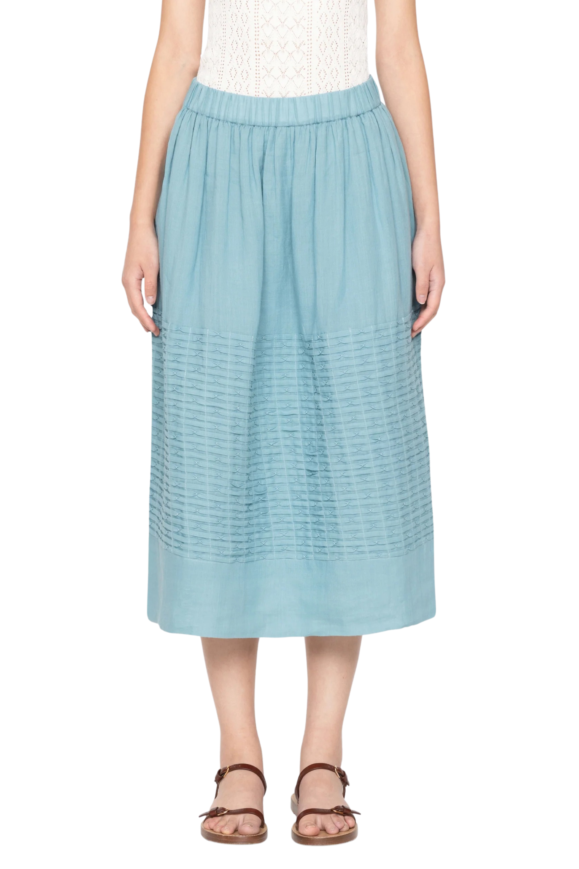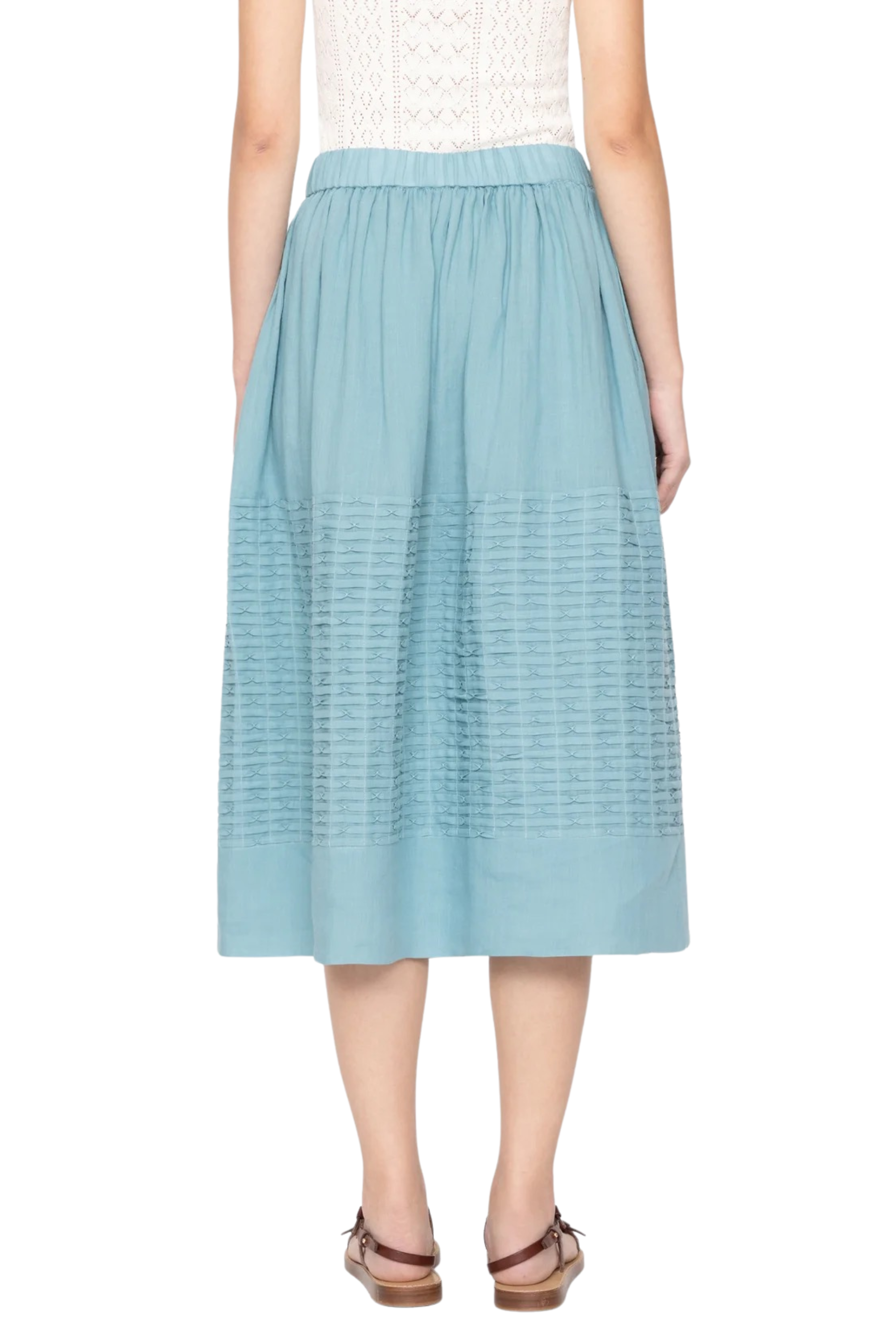 The Violet skirt features pintuck detailing, an elasticized waistband, and a breezy midi silhouette. Paired with the Violet tank, it creates a fresh, effortless spring outfit.