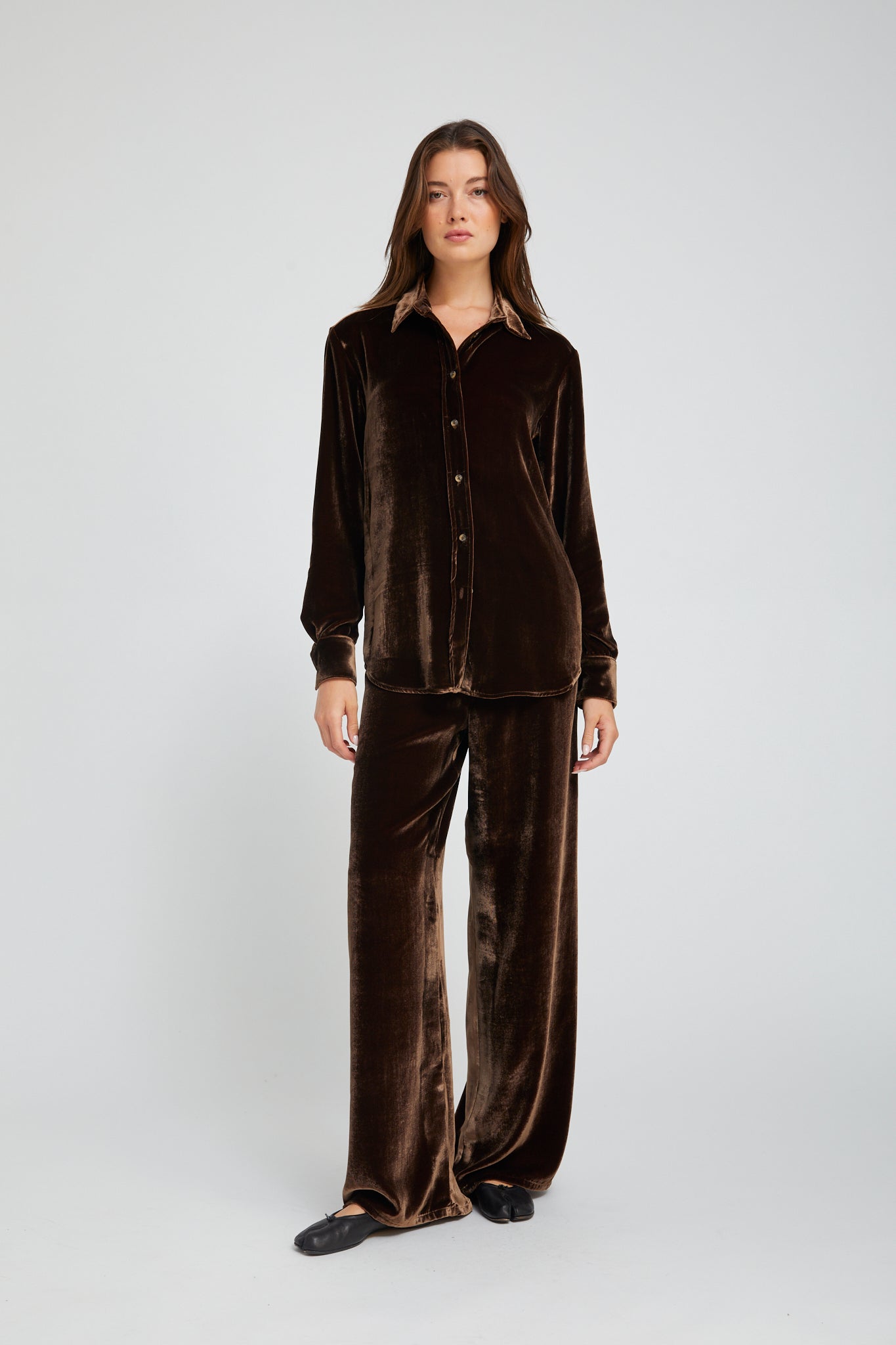 An elevated version of the wide leg pants ─ crafted from silk velvet for an ultra-soft feel and a lustrous sheen. These pants feature a comfortable, loose fit that is designed with a stretchy elastic, waistband for effortless pull on wear. Pair with the Elise Button Down for the perfect set.