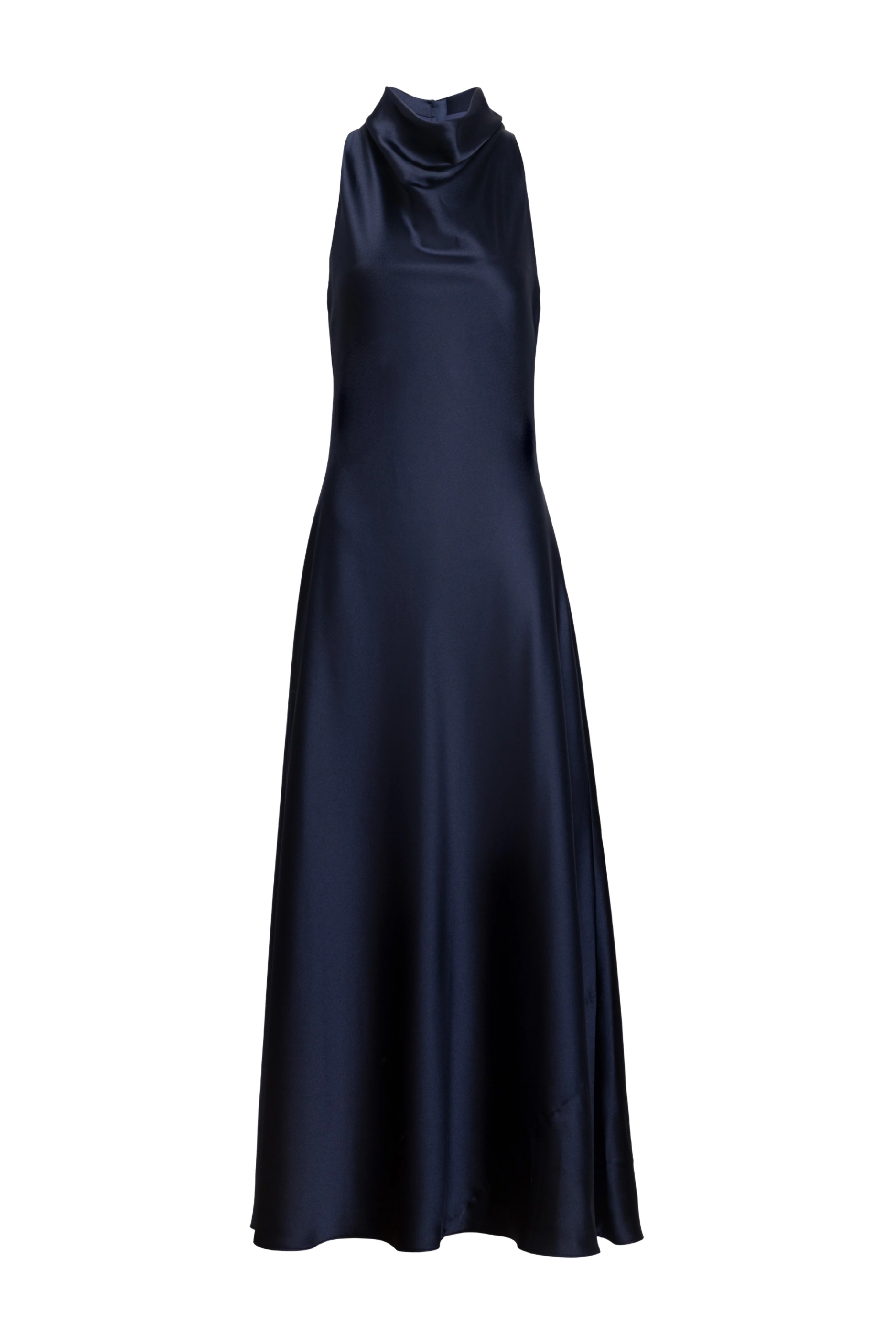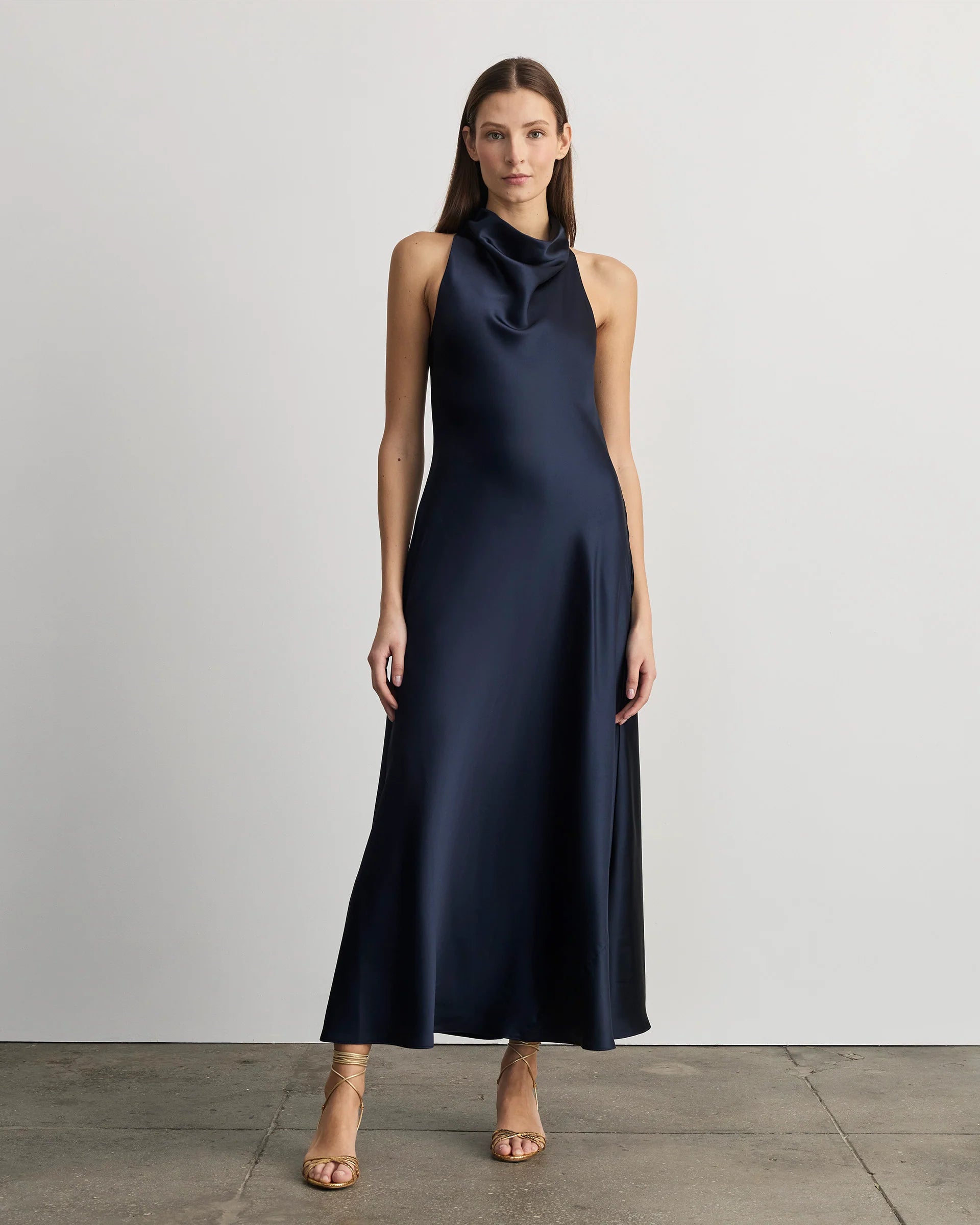 Designed in a soft-to-the-touch satin, Celinda features cascading folds on the halter neckline and a flattering bias-cut that glides across the room with you.