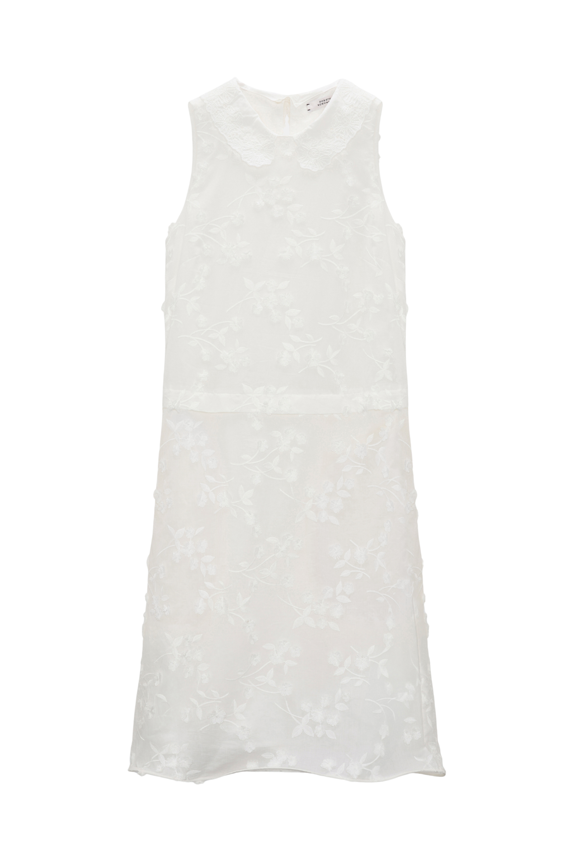 The shift dress is made from cotton-fil-coupé and has a removable broderie round collar. The slim-fitting style has a keyhole closure are the nape.
