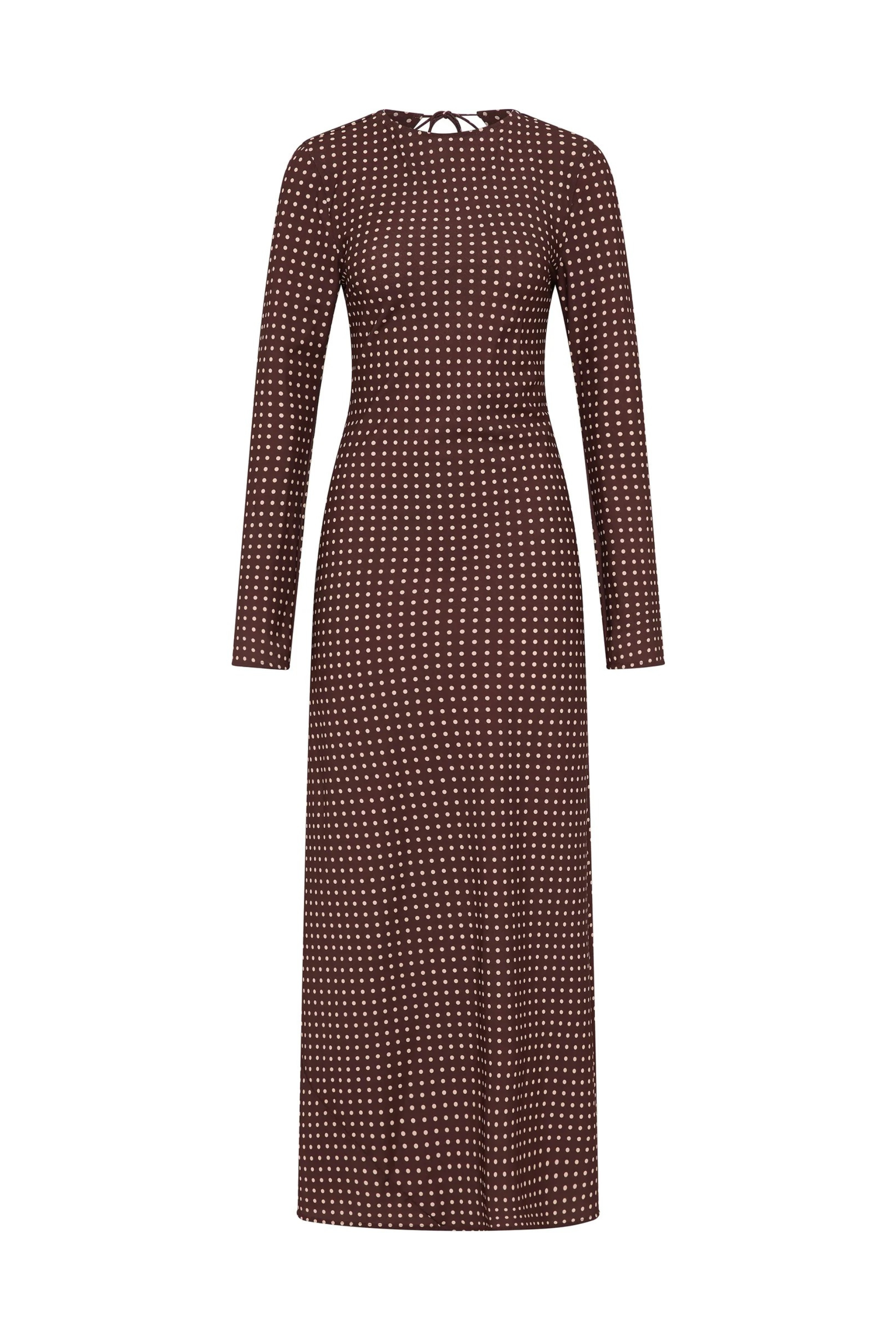 A vintage-inspired maxi dress, designed from a responsible georgette crepe in a nostalgic polka dot. With long straight sleeves and an open back bodice, with two delicate tie details, it falls into a soft A-line skirt that grazes the ankles. Style with a simple sandal or kitten heel for transeasonal occasionwear.