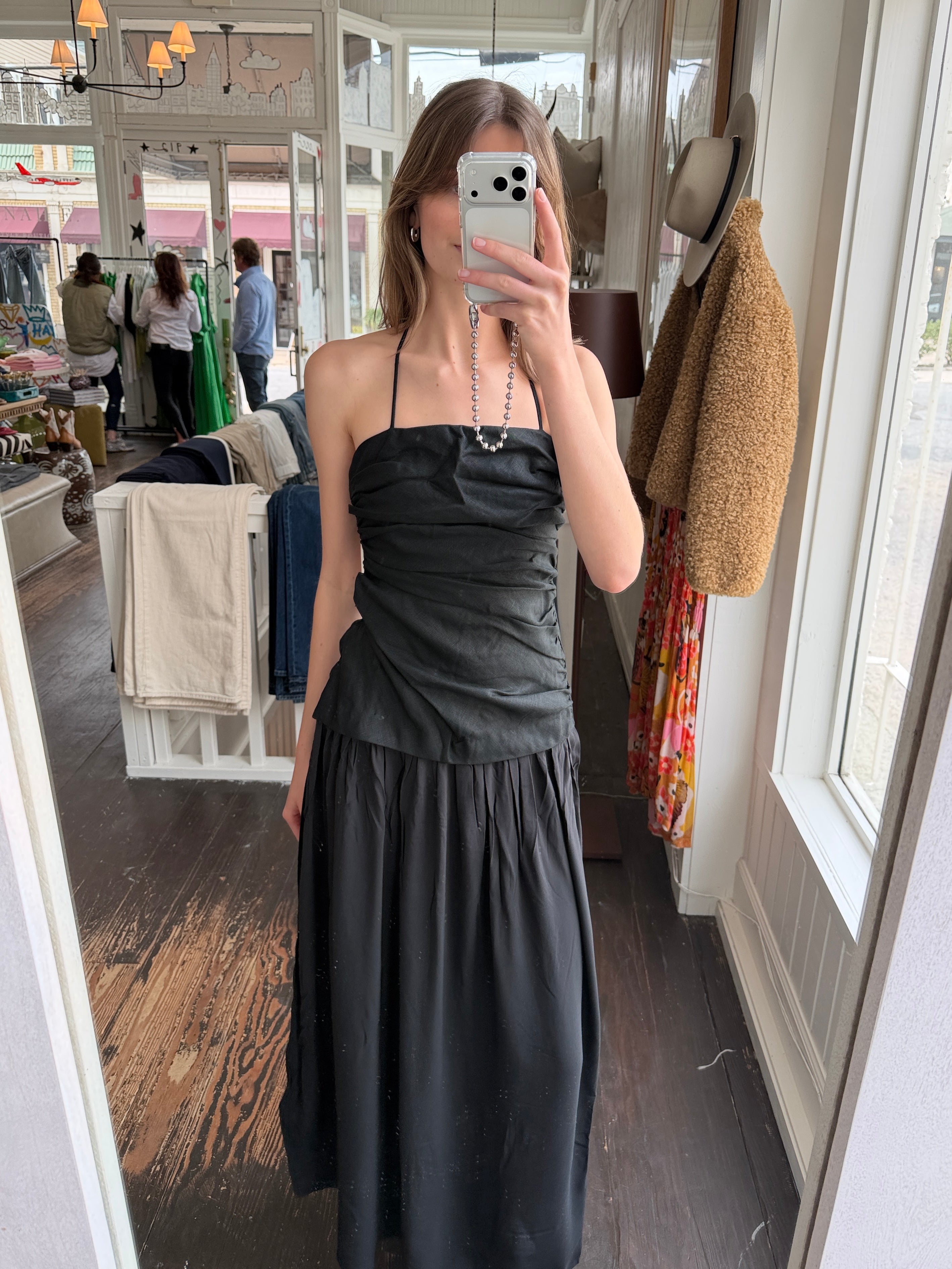 A vintage-insired maxi dress, designed from a signature 100% European Flax® linen in a soft shade of pink. Featuring a halterneck with thin adjustable ties, it is fitted through the bodice with subtle gathering through the front. The silhouette also offers a drop waist with a contrasting responsible rayon skirt. Slightly A-line, it is lightweight and breezy for summer occasionwear.
