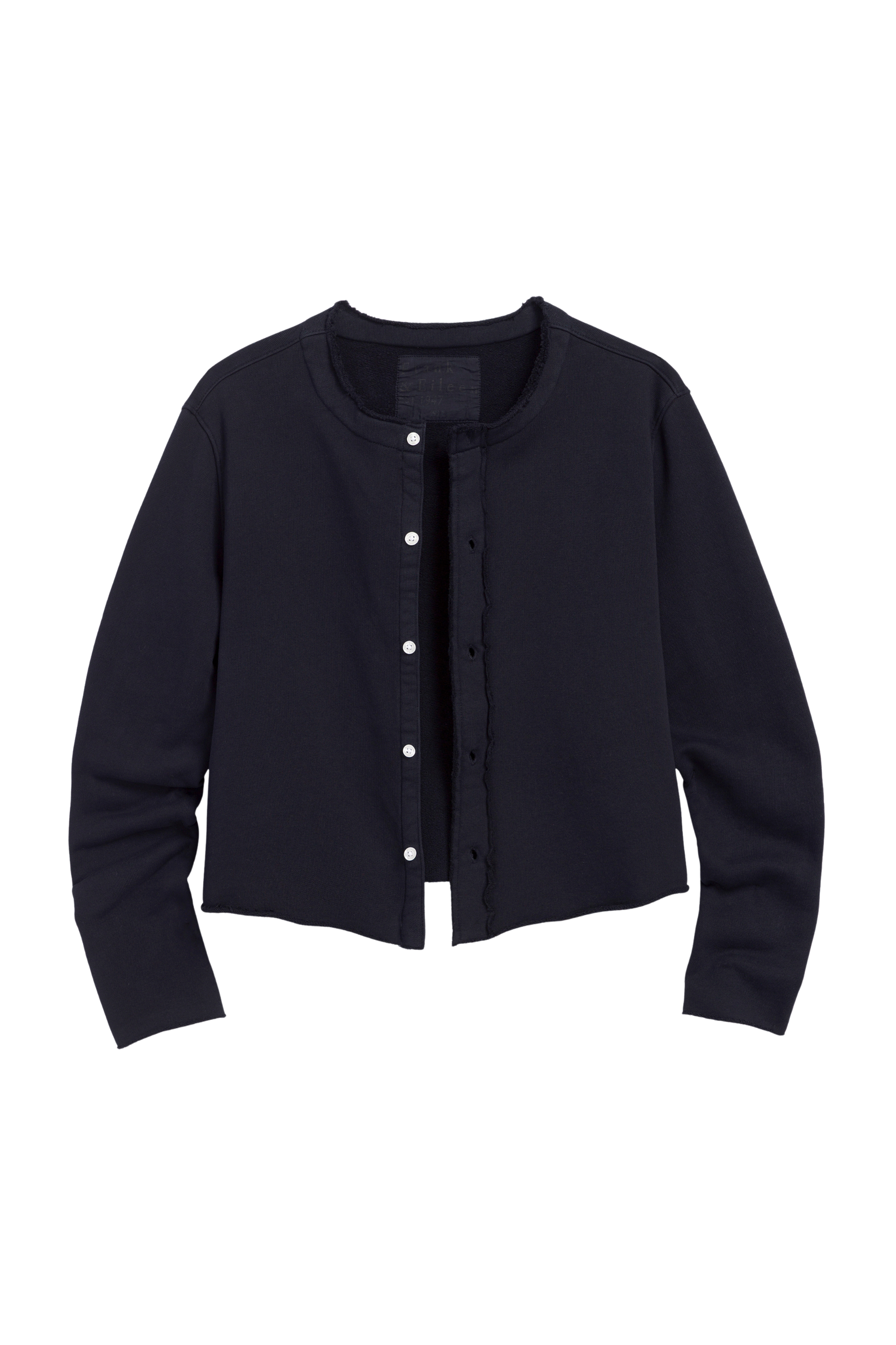 The perfect mix of feminine and functional, Jackie features a petite, square-ish silhouette, delicate buttons, and a signature raw edge hem in soft, cozy Triple Fleece.