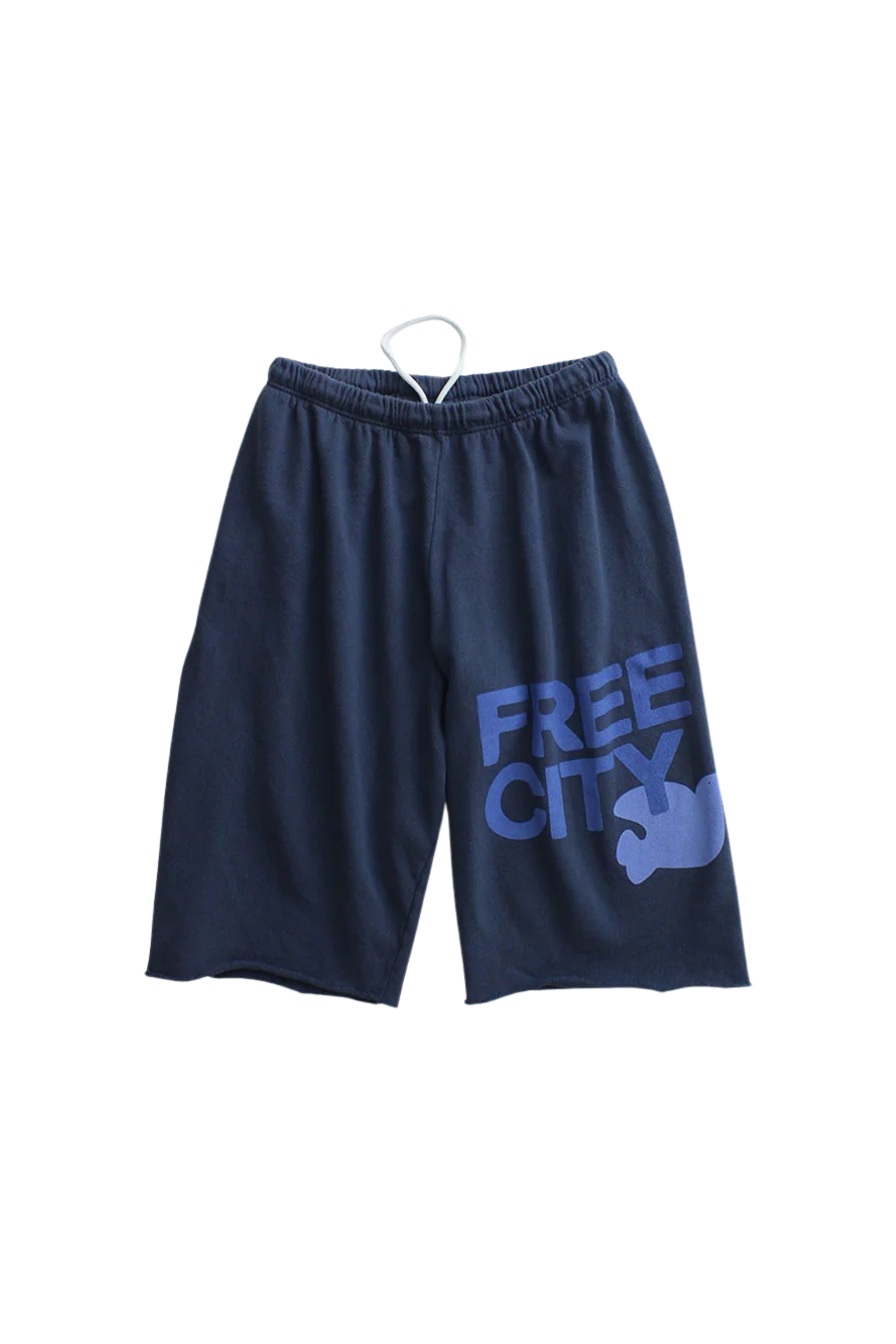 NEW Unisex FREECITY cutoffs in bloom with classic "FREECITY" print in moonshrooms Blue "FREECITYDOVE" in tonal dark purple, covered elastic waist, pull drawcord, and home/cut raw edge.