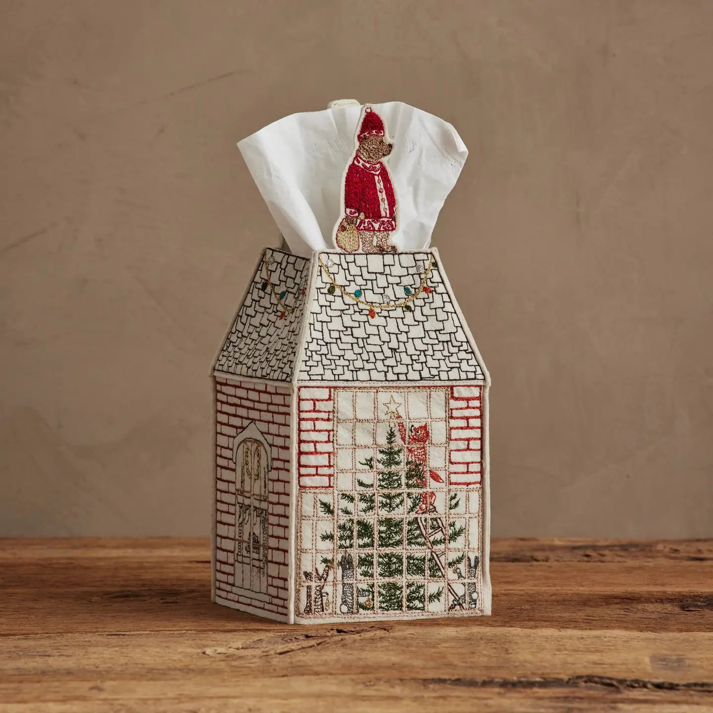 Leave no household object undecorated this Christmas, elevate your tissue box with our Home for the Holidays felt cover. Embroidered on all sides, our tissue box cover depicts a glowing holiday house. Peek inside each window to find fox decorating the tree, bunny setting up the buffet, and a beautiful decorated fireplace. Cat greets us at the door with a wrapped gift. Up on the rooftop find Santa Bear, Rudolph and your tissue as a plume of smoke from the chimney!