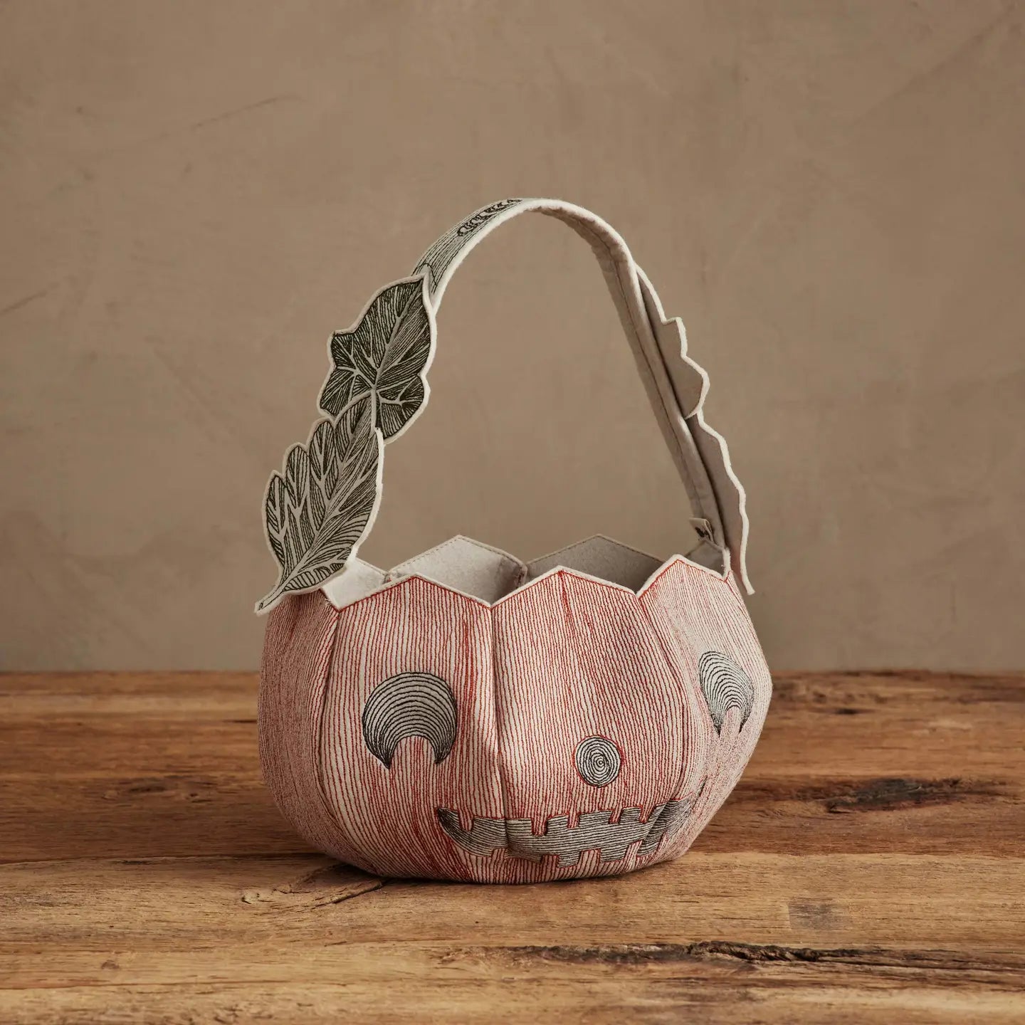 Our stitched spin on the classic trick-or-treat bucket! Embroidered on all sides, our felt Jack-o'-Lantern will make your Halloween even more special. The smiling Jack-o'-Lantern is composed of thousands of hand-drawn stitches, and the strap resembles a pumpkin vine. The top of the handle has a caterpillar and a ladybug. Unique, appliquéd leaves are sewn to the sides of the strap. Skip the plastic pumpkin this year and add our heirloom staple to your family’s Halloween traditions.