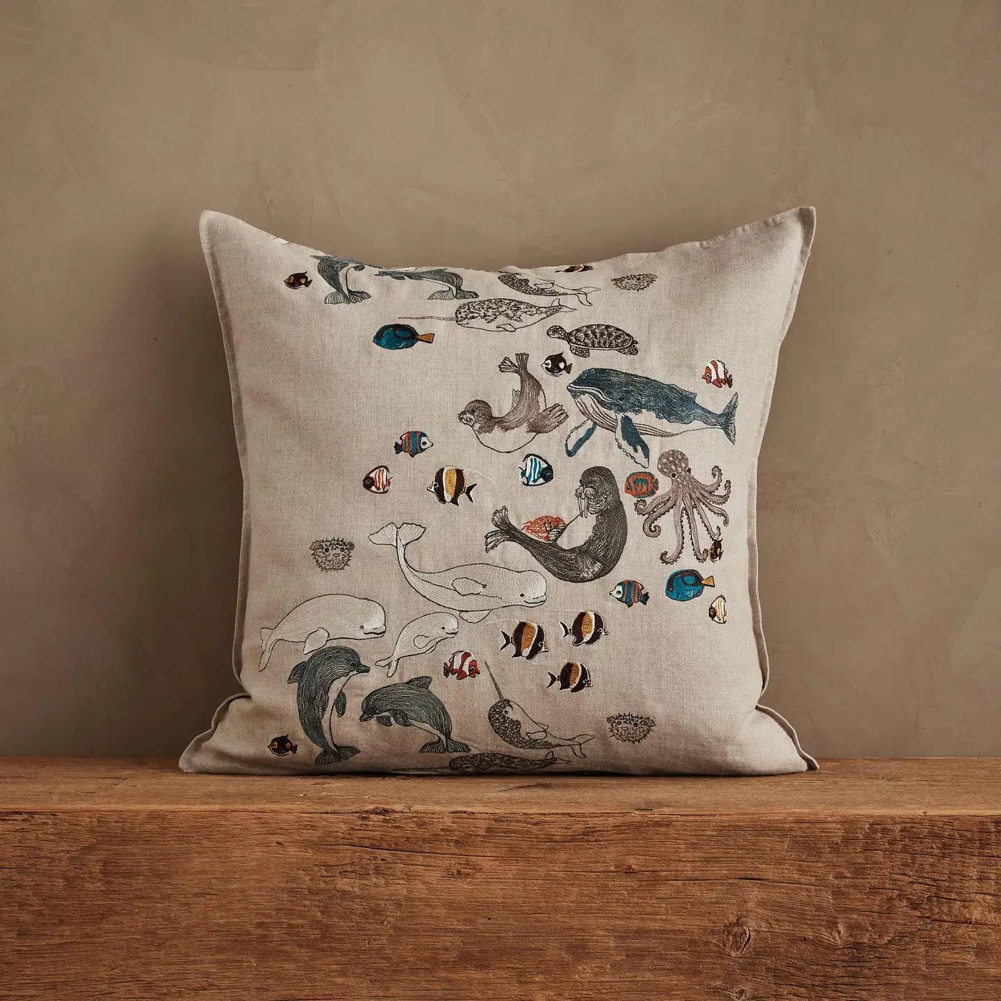 Dive into decorating this season with the swim team! Our Swim Team pillow celebrates the diversity of life found in our world’s oceans. Discover schools of fish, breaching whales, baby belugas and a friendly walrus in the tides of our embroidered design. Measures 20" × 20"