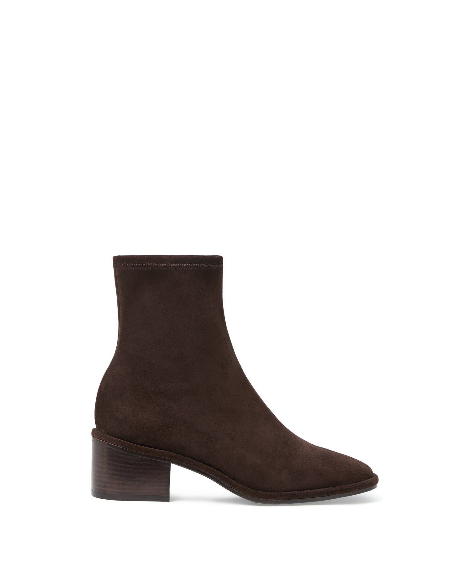 Mid-heel ankle boot in brown stretch suede. Features a stacked block heel, a concealed side zipper, and a padded leather footbed with gold stamped logo. 1.5-inch heel.