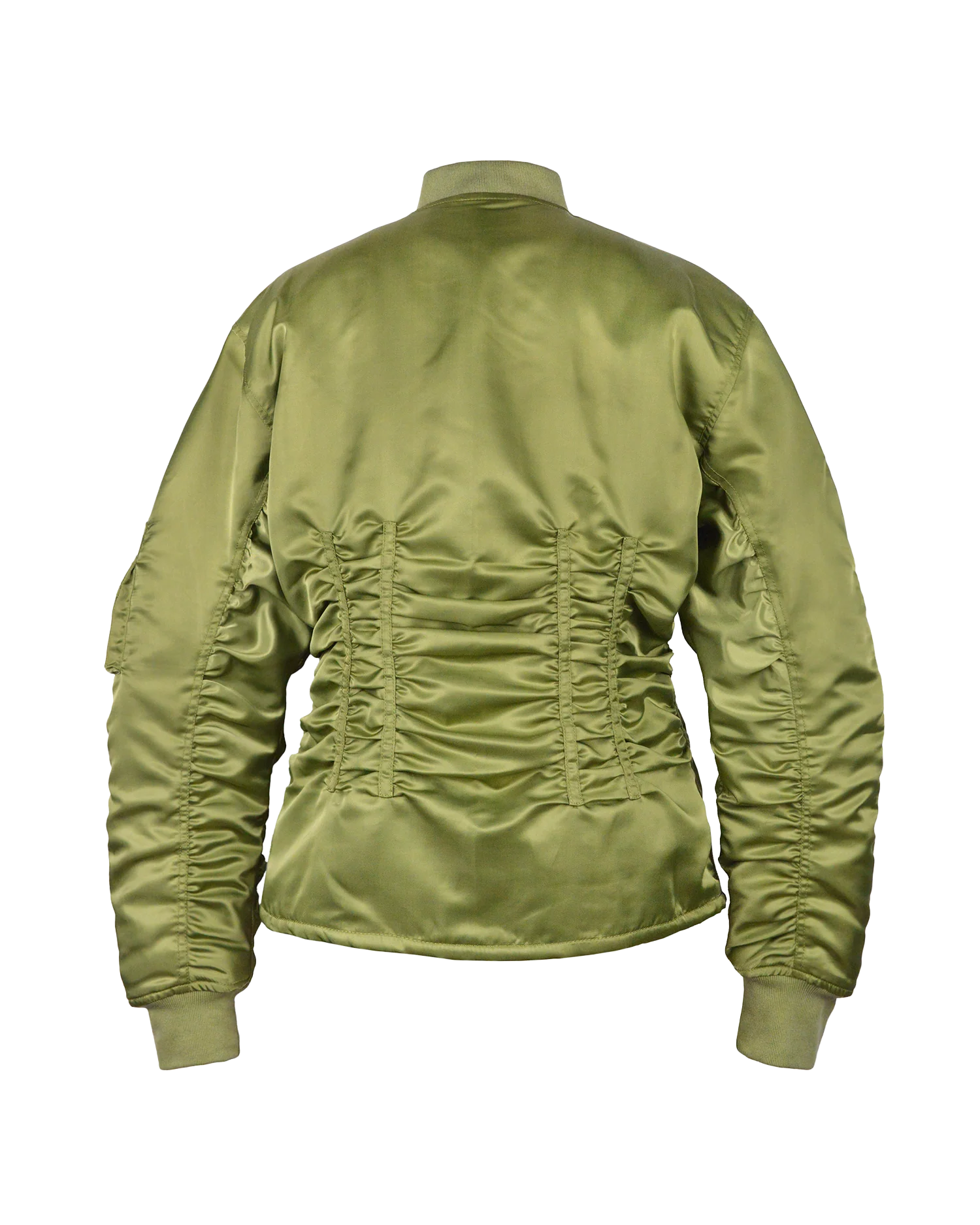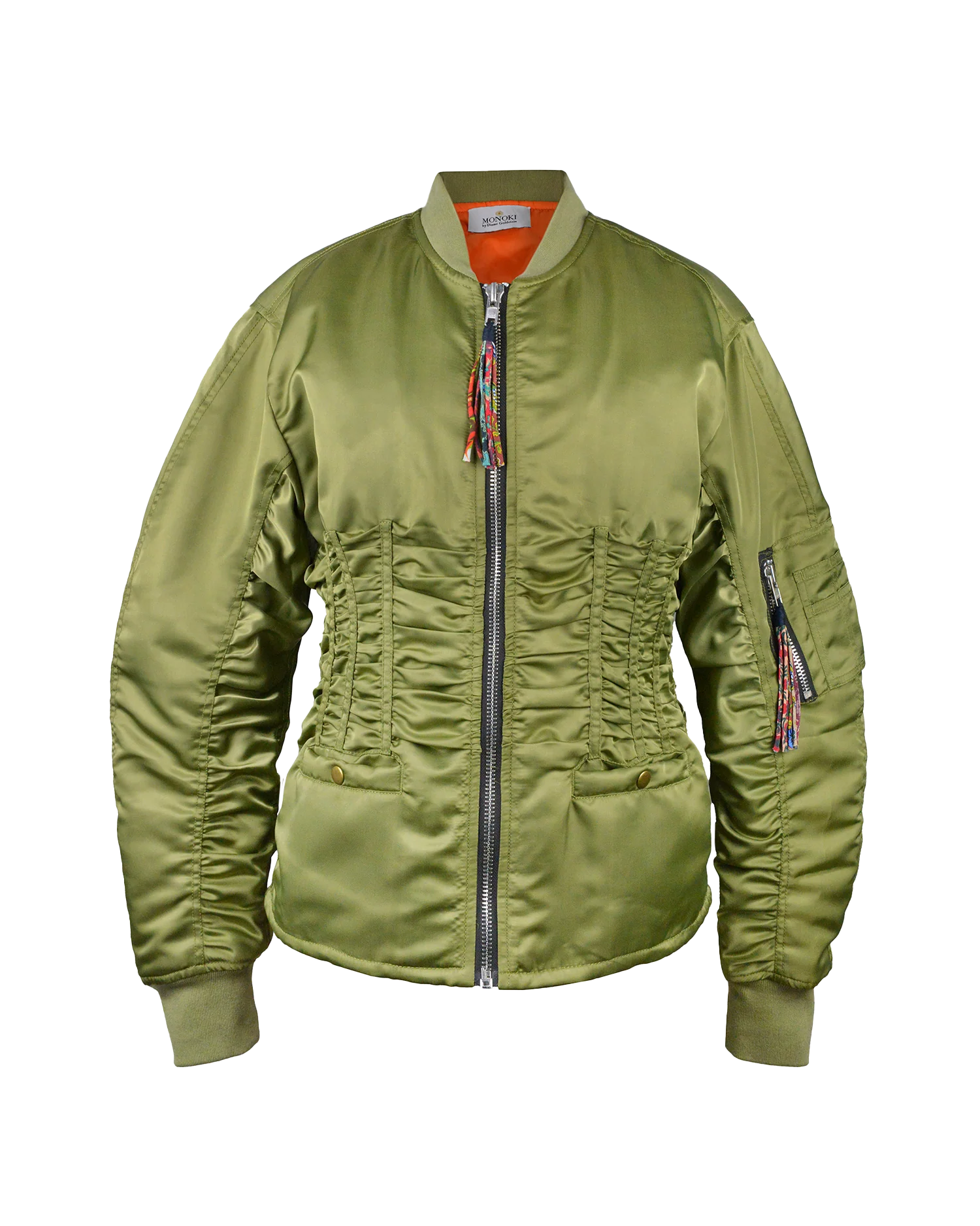 Elevate your wardrobe with this timeless khaki bomber jacket, designed for both style and functionality. Featuring a bold orange lining, this jacket stays true to the classic aviation-inspired look. The cinched and ruched waist ensures a flattering fit, while the gathered sleeves add a touch of modern volume.