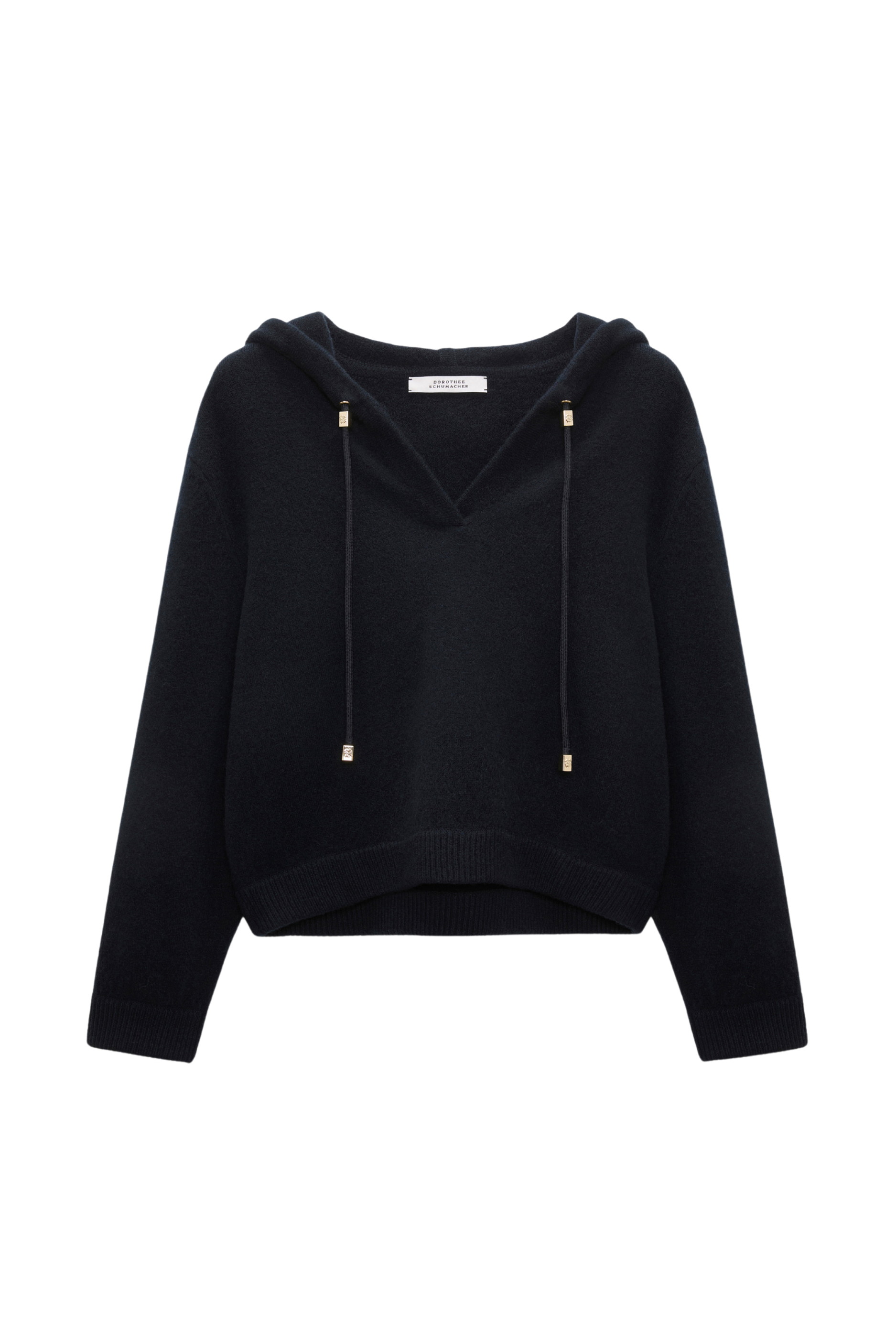 The hooded pullover is knit in a soft wash Merino-cashmere mix and has an open neckline. The cropped style has a boxy fit and drawstring with decorative D-rose hardware.