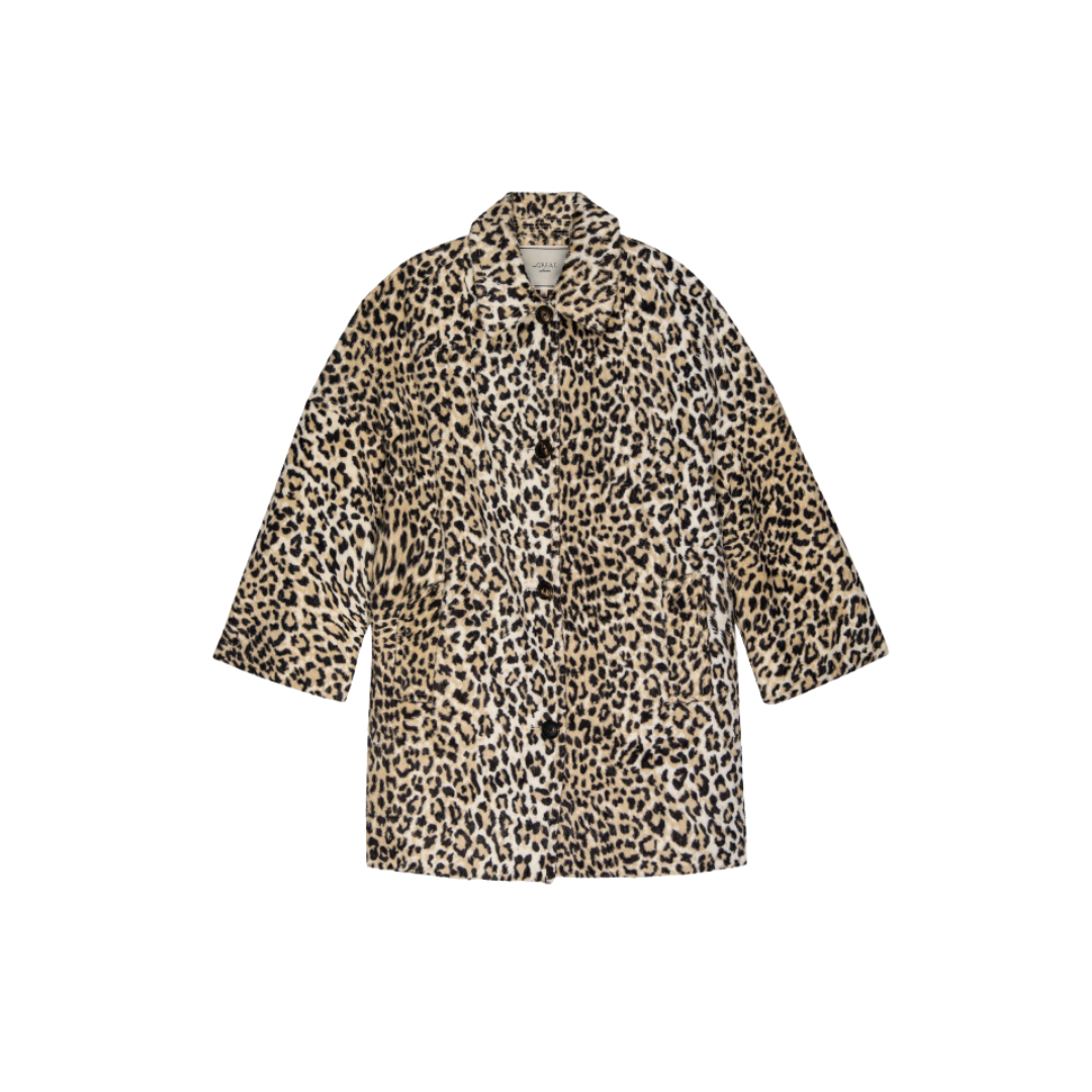 Inspired by a midcentury lady’s coat, The Car Coat is made from a faithful reproduction of a crushed faux fur leopard print with a quilted satin lining interior. With dropped shoulders, angled armholes, cropped sleeves, tailored collar, welt pockets, and sophisticated horn buttons up the front.