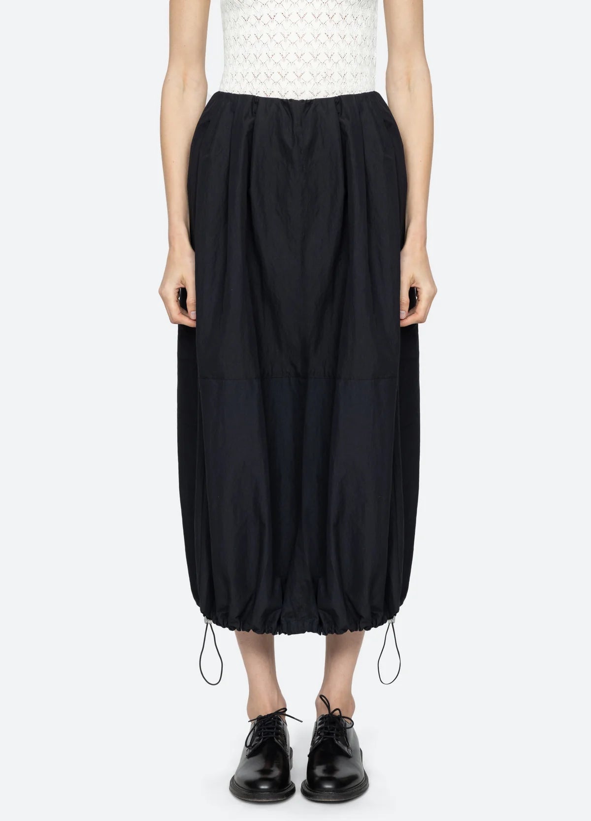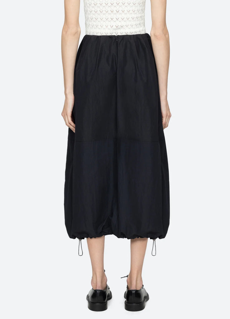 The Abilene bubble skirt is shaped in a chic midi silhouette with an elasticized waistband for an easy, flattering fit. Adjustable drawstrings at the hem add a touch of softness and allow for personalized styling.