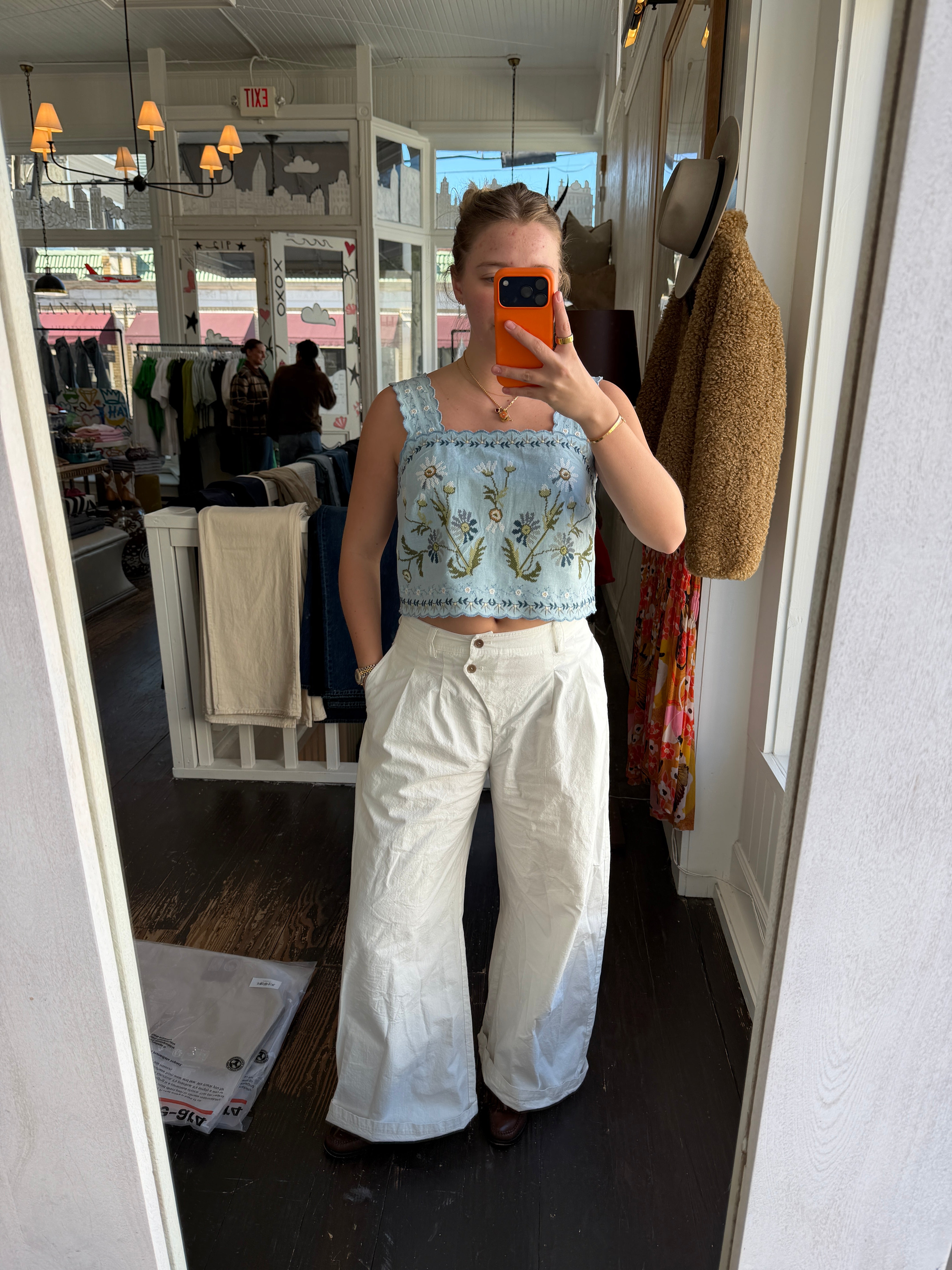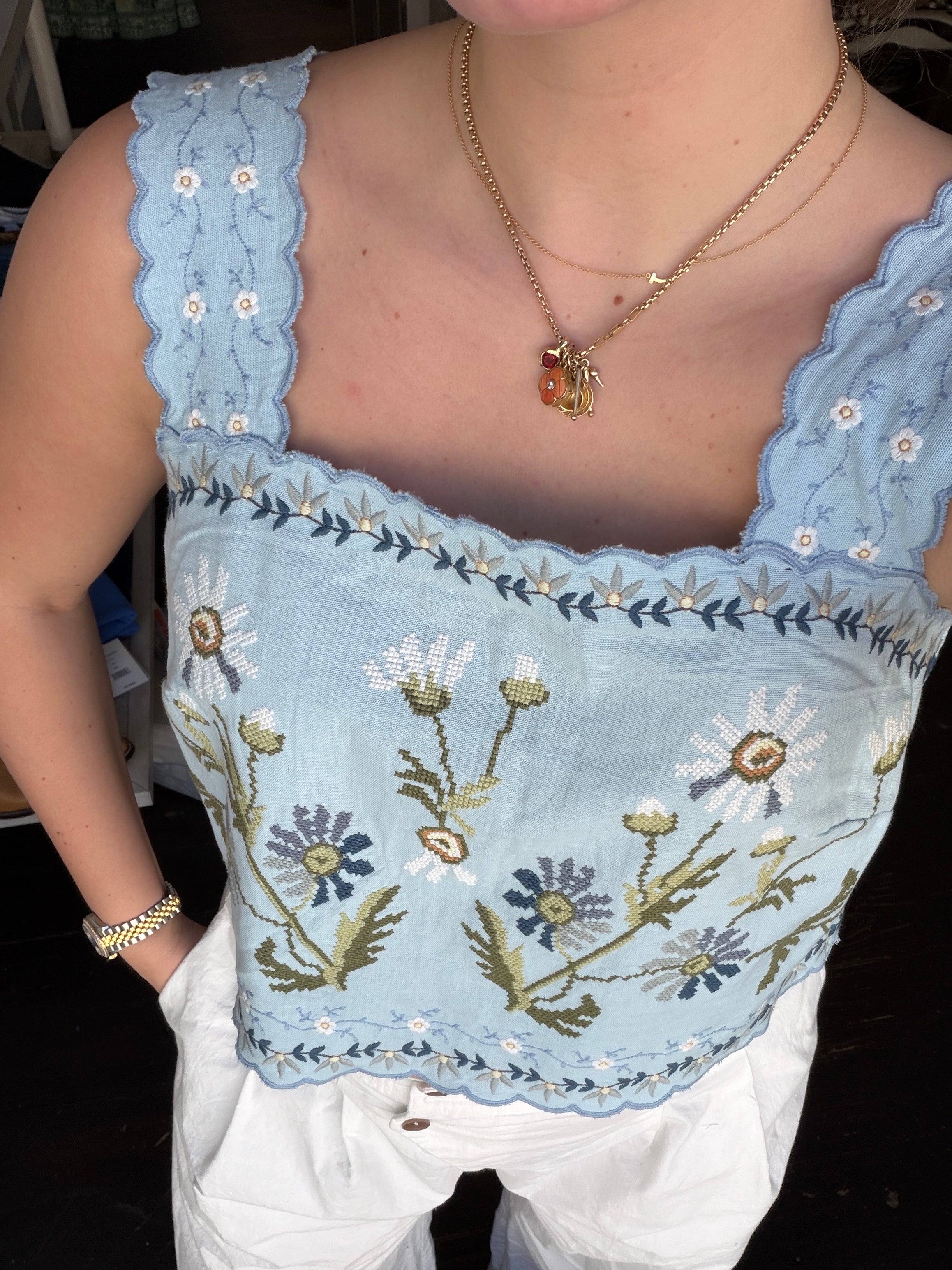 The Audra embroidered tank top features a cropped silhouette with delicate scalloped edges and tie fastening at the back. Adorned with detailed floral embroidery throughout, it offers a feminine and charming finish.