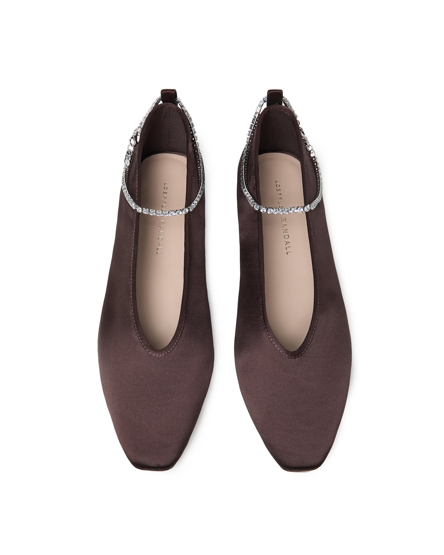 Square toe ballet flat in dark brown satin. Features a removable crystal ankle strap and padded footbed with gold stamped logo. Slips on.
