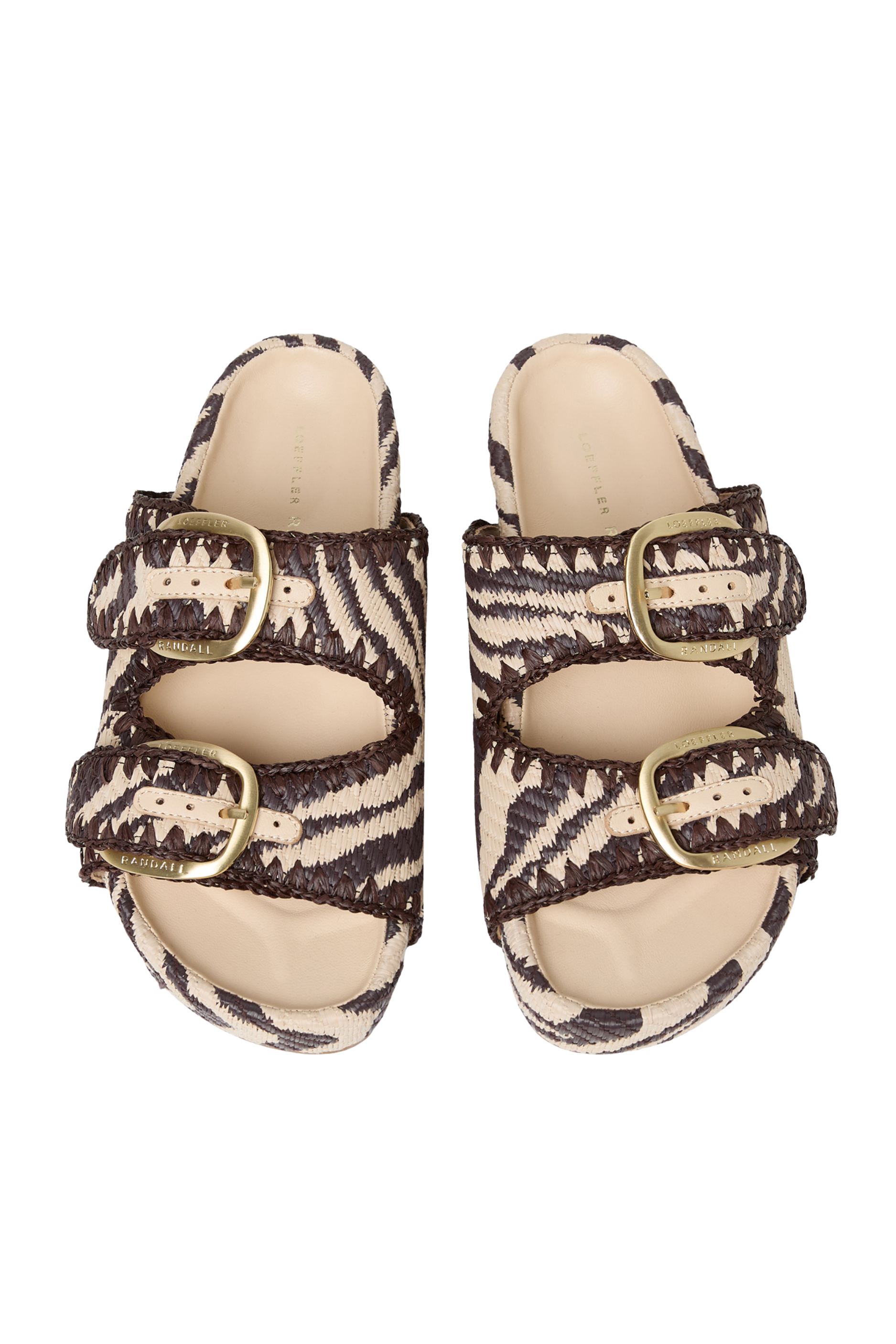 Two-band platform sandal in cream zebra woven straw with black whipstitch detailing. Features large buckle hardware, a padded leather footbed, an open toe, and Velcro fastenings at the straps. 1.75-inch platform.