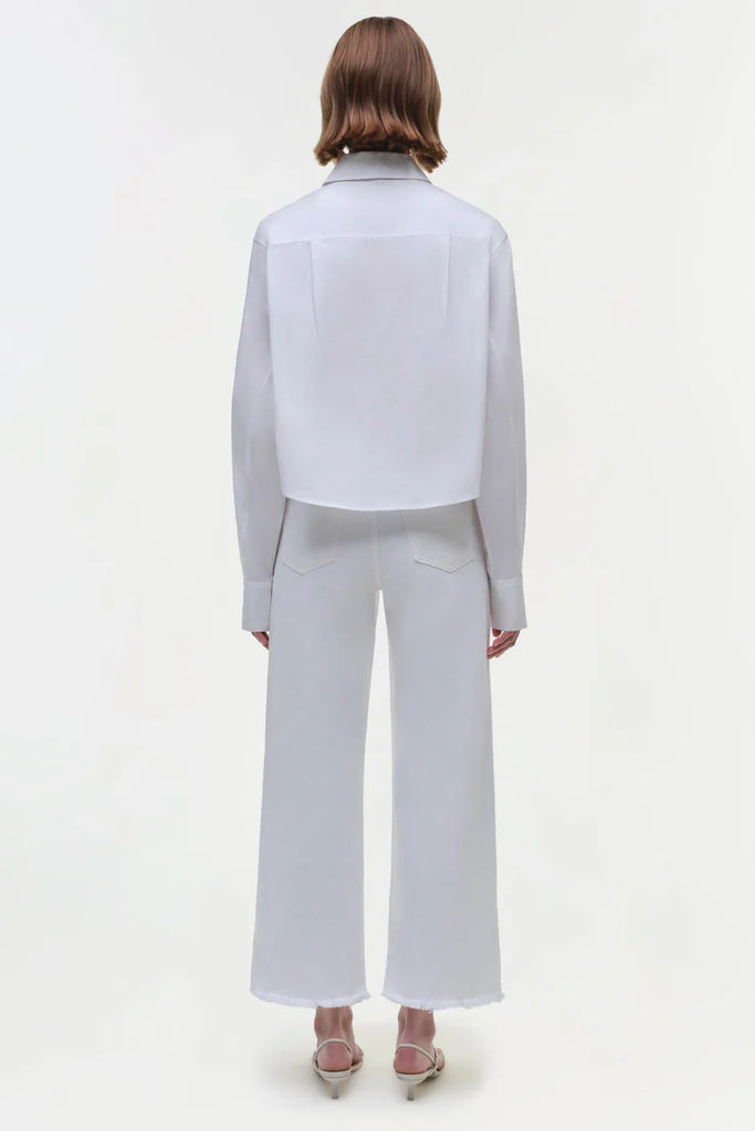 The Renata Shirt in White. Elevate your wardrobe with this crisp cropped button-down. Designed with a sharp collar and a clean front, its tailored fit provides a sophisticated silhouette. Perfectly versatile, it's a modern staple for both casual and dressier ensembles.