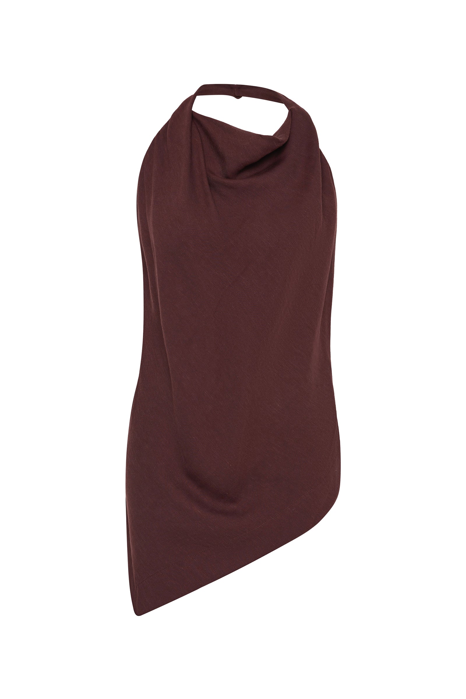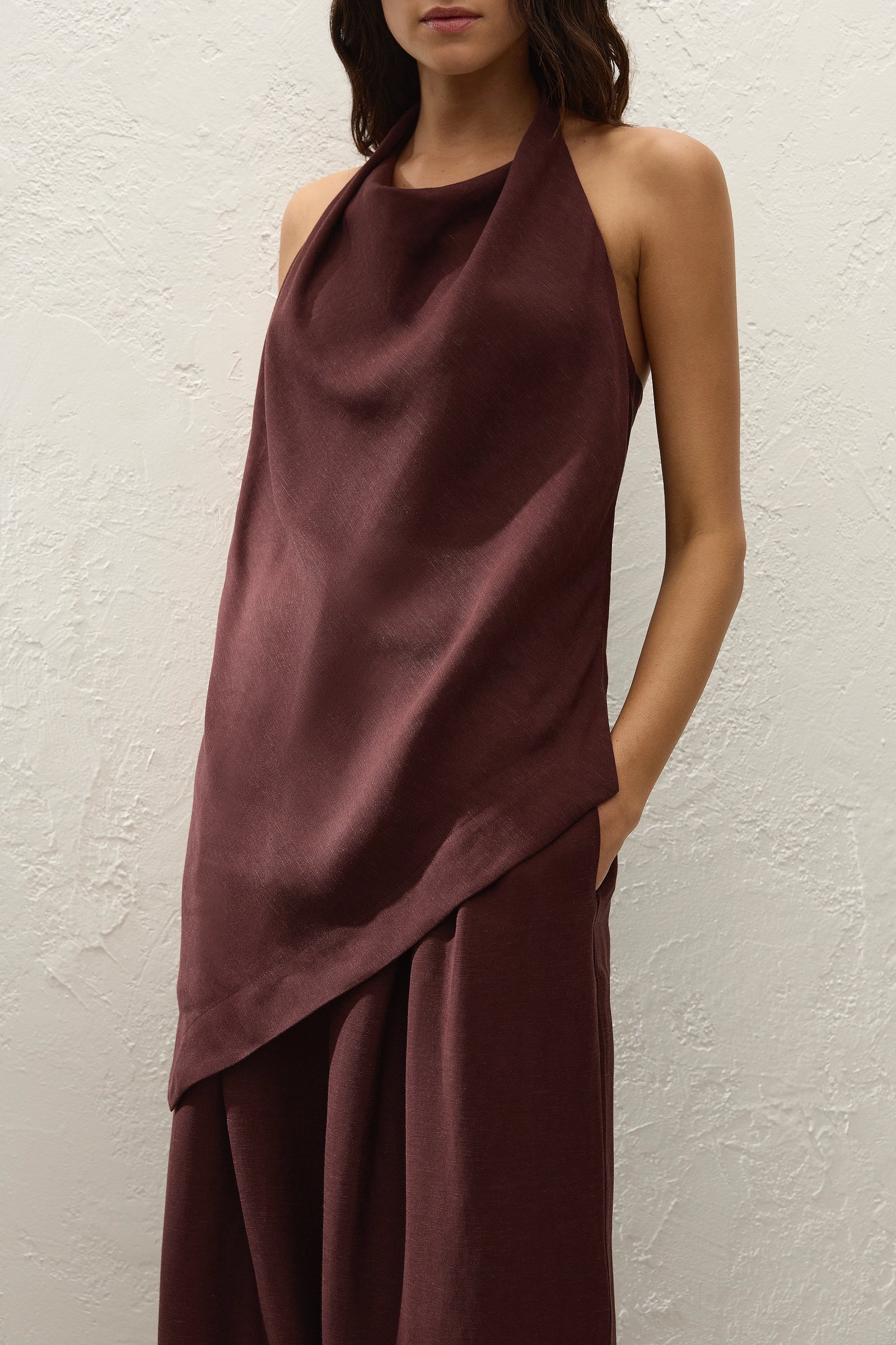A halterneck top, designed from a signature soft tailoring fabrication, blending viscose, tencel, rayon and European Flax® linen, in a deep chestnut brown. Fixed at the back neck with a button closure, it drapes through the front with a cowl-style detail around the neckline. Hanging off the body in an elevated fashion, it crops below the hips and finishes with an asymmetric hem. Style over the matching Astrid Trouser for refined yet relaxed set dressing.
