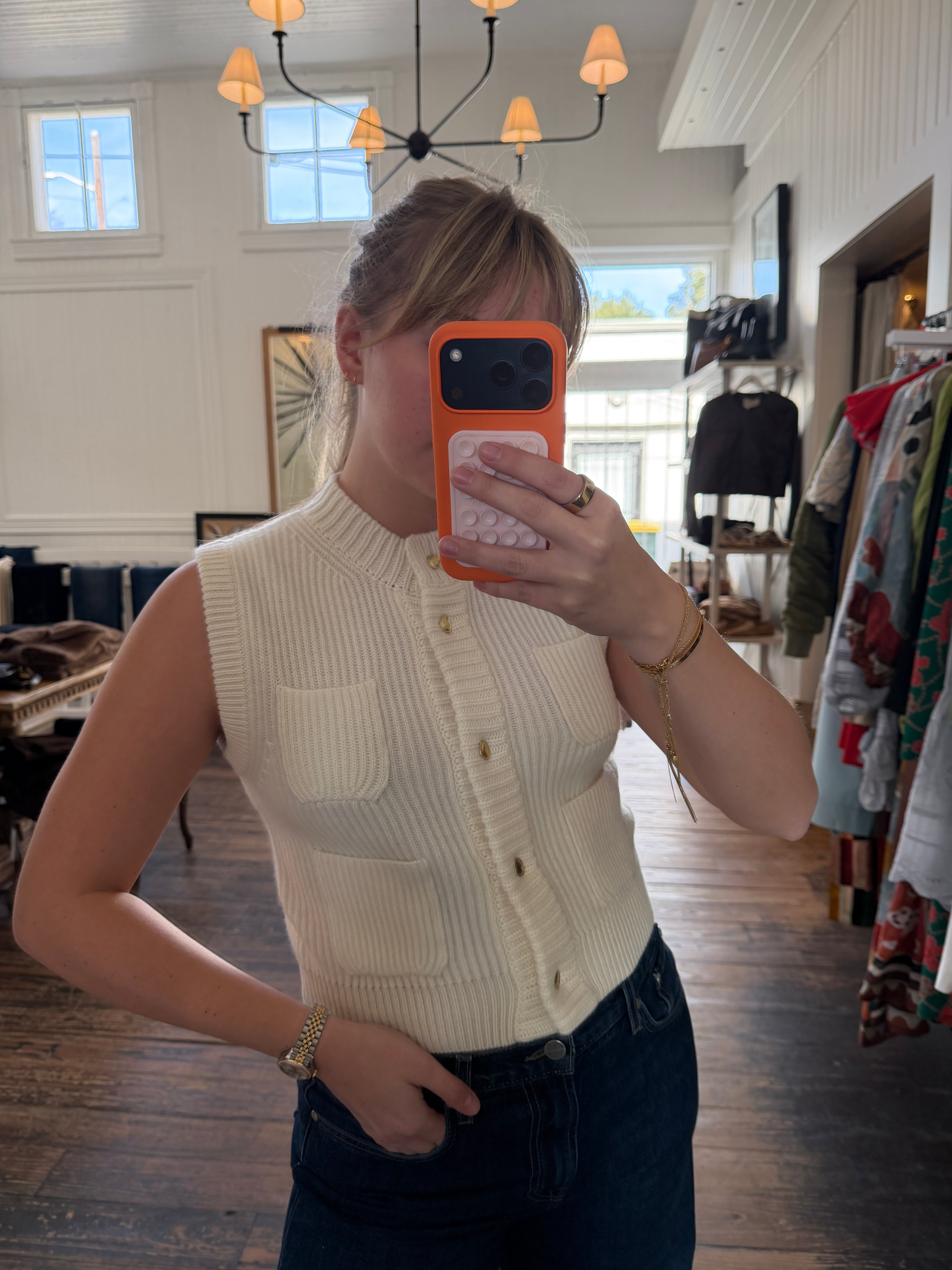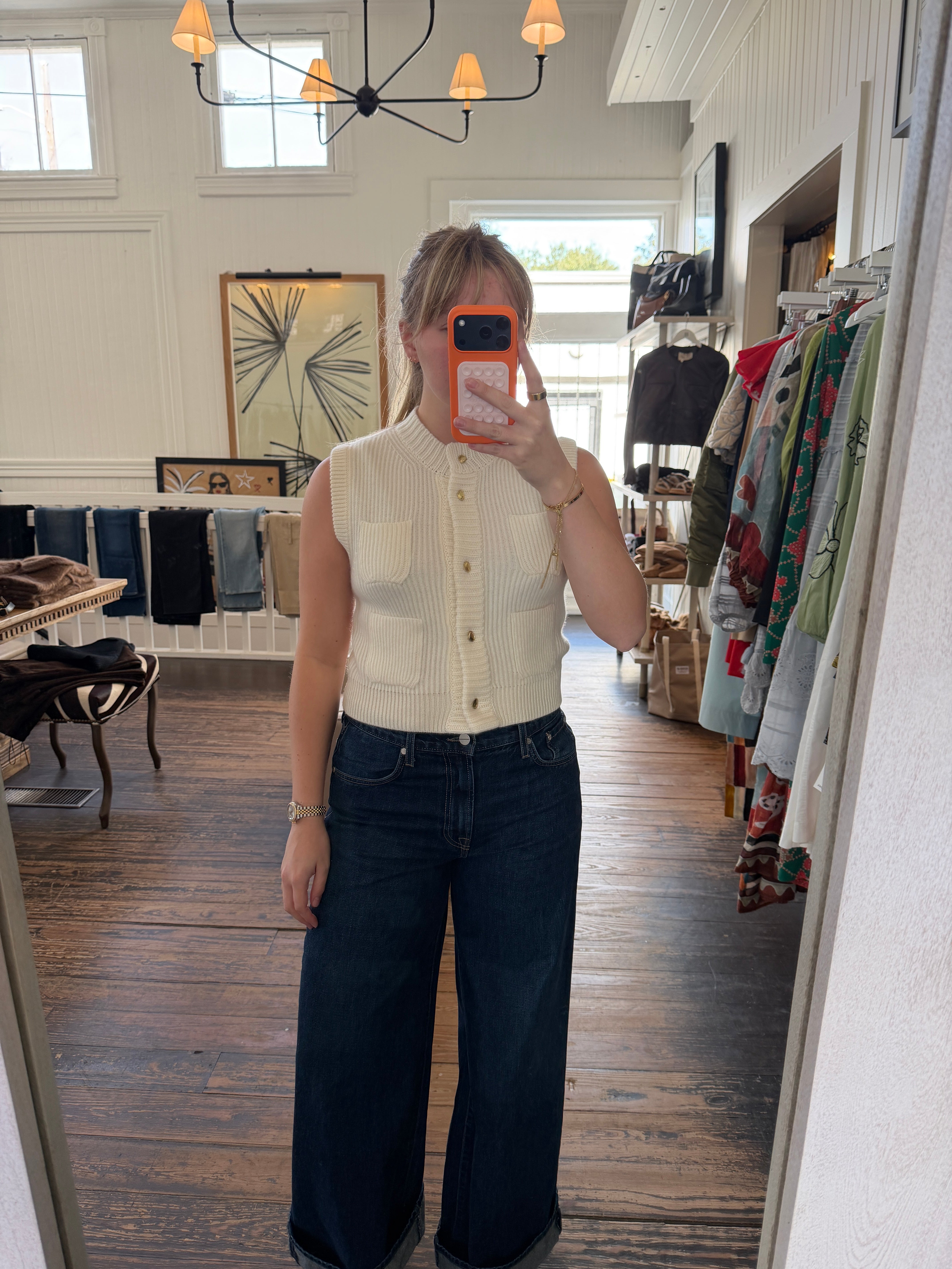 with a straight cut and patch pockets, this cashmere–and–wool vest in a fisherman's rib is a practical yet chic separate that will be perfect for trans–seasonal days. the gleaming metal buttons and raised collar add bold brio for a slick feminine–urbanite aesthetic.