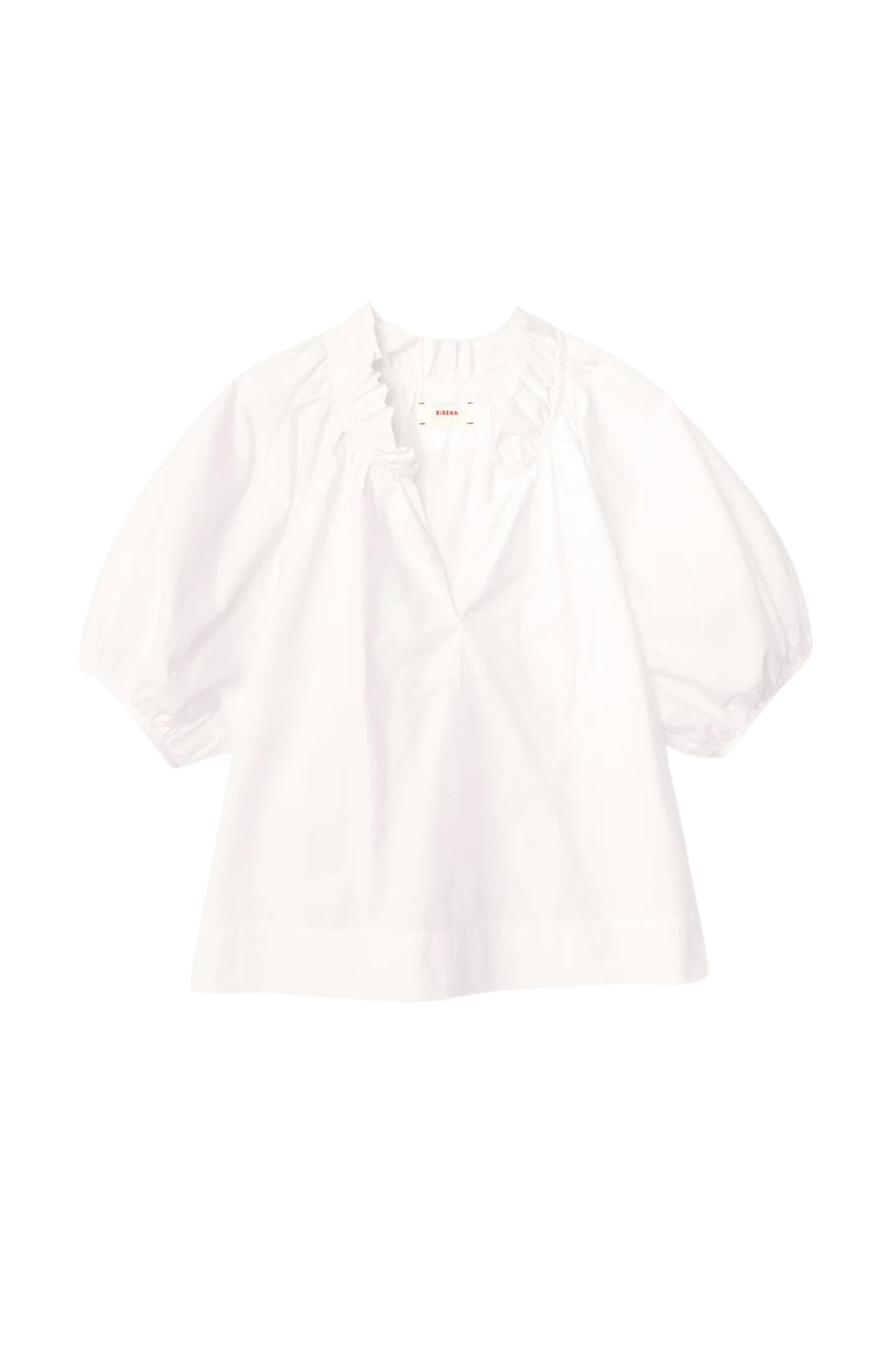 Ruffle Up. Clementine is new this season in a crisp paper poplin with a refined feel. Clementine is a femme blouse featuring a deep V-neck with ruffle detailing and shirred puff sleeves.