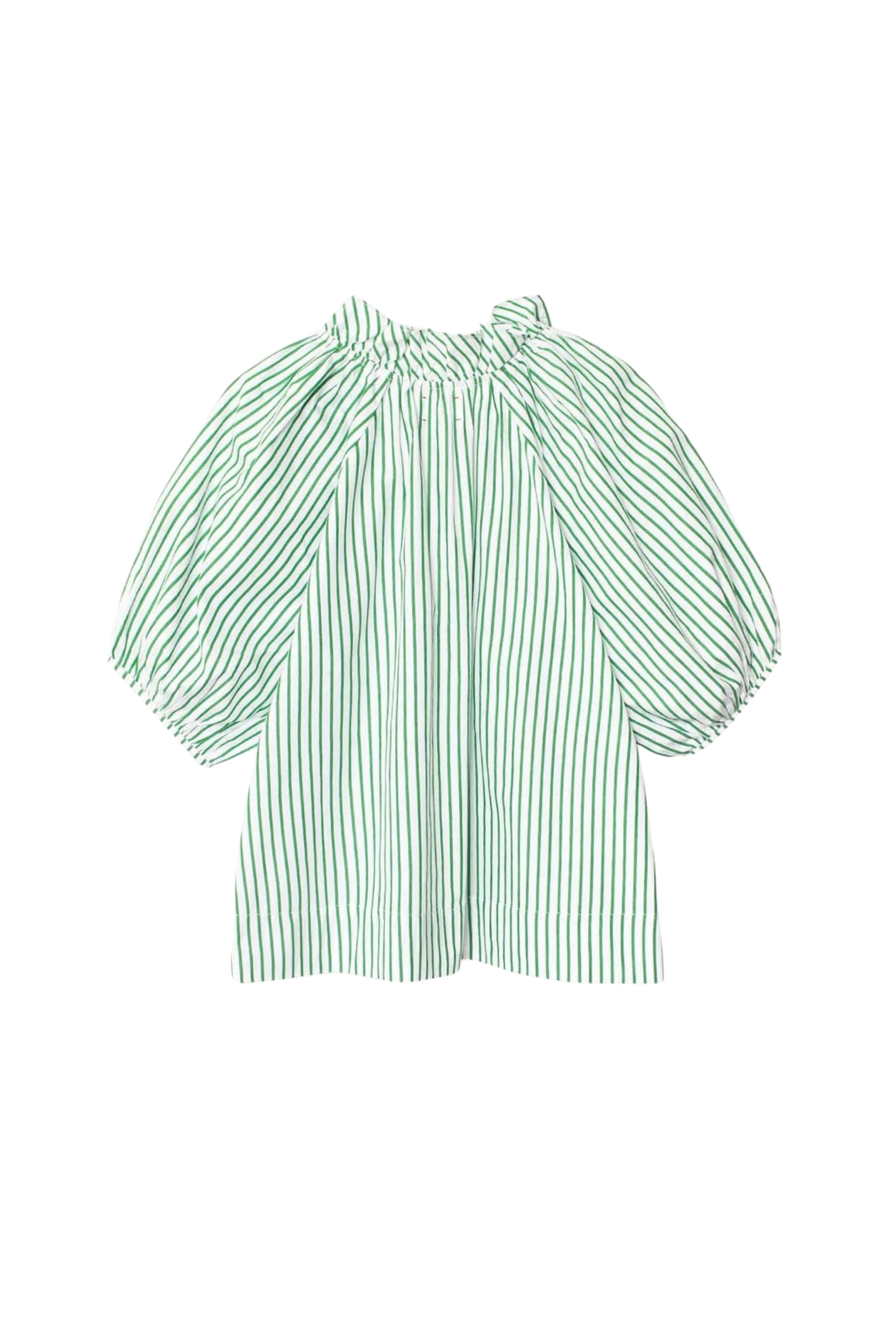 Striped Delight. Clementine is new this season in a crisp multicolor stripe cotton. Clementine is a femme blouse featuring a deep V-neck with ruffle detailing and shirred puff sleeves.