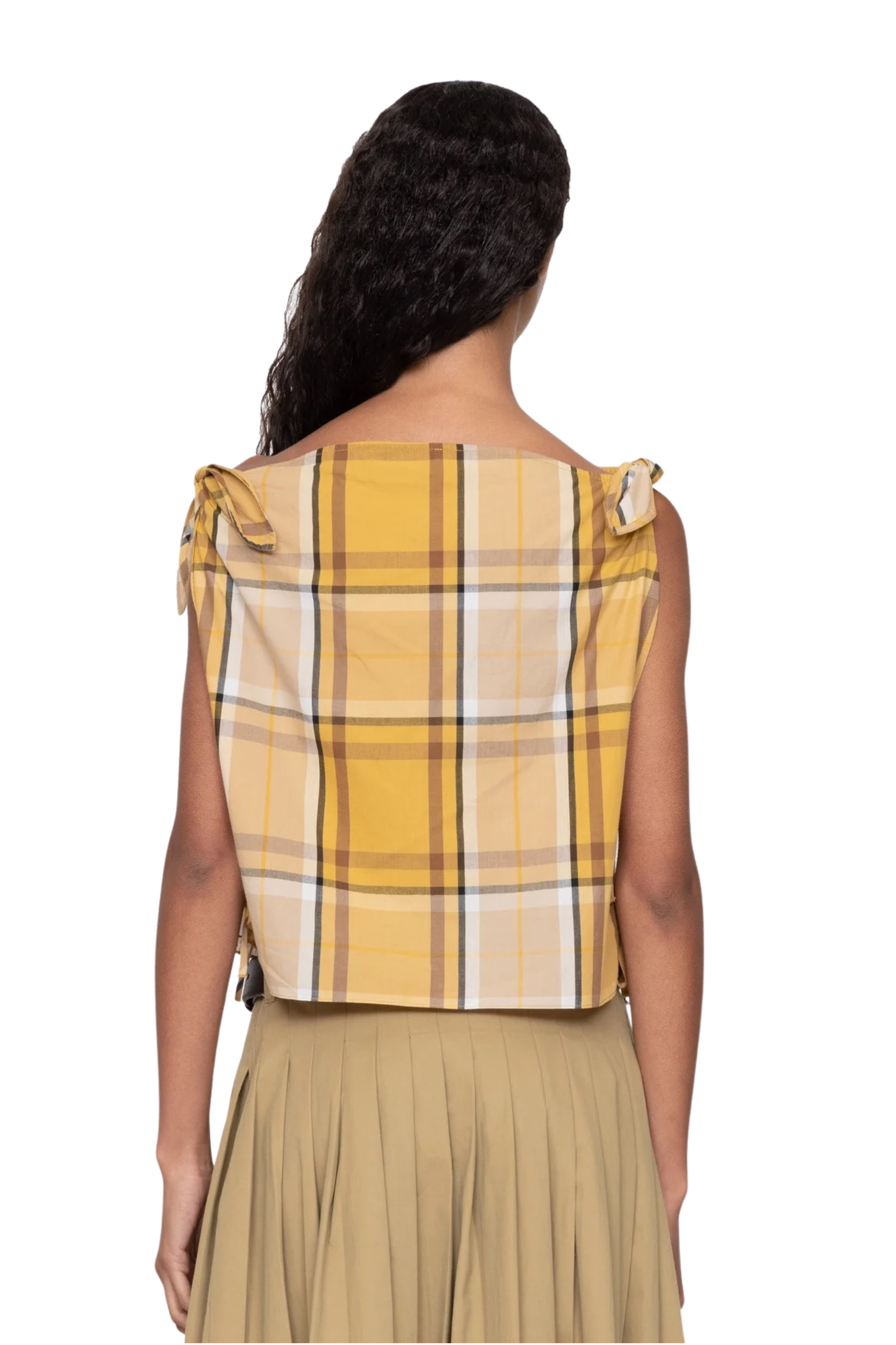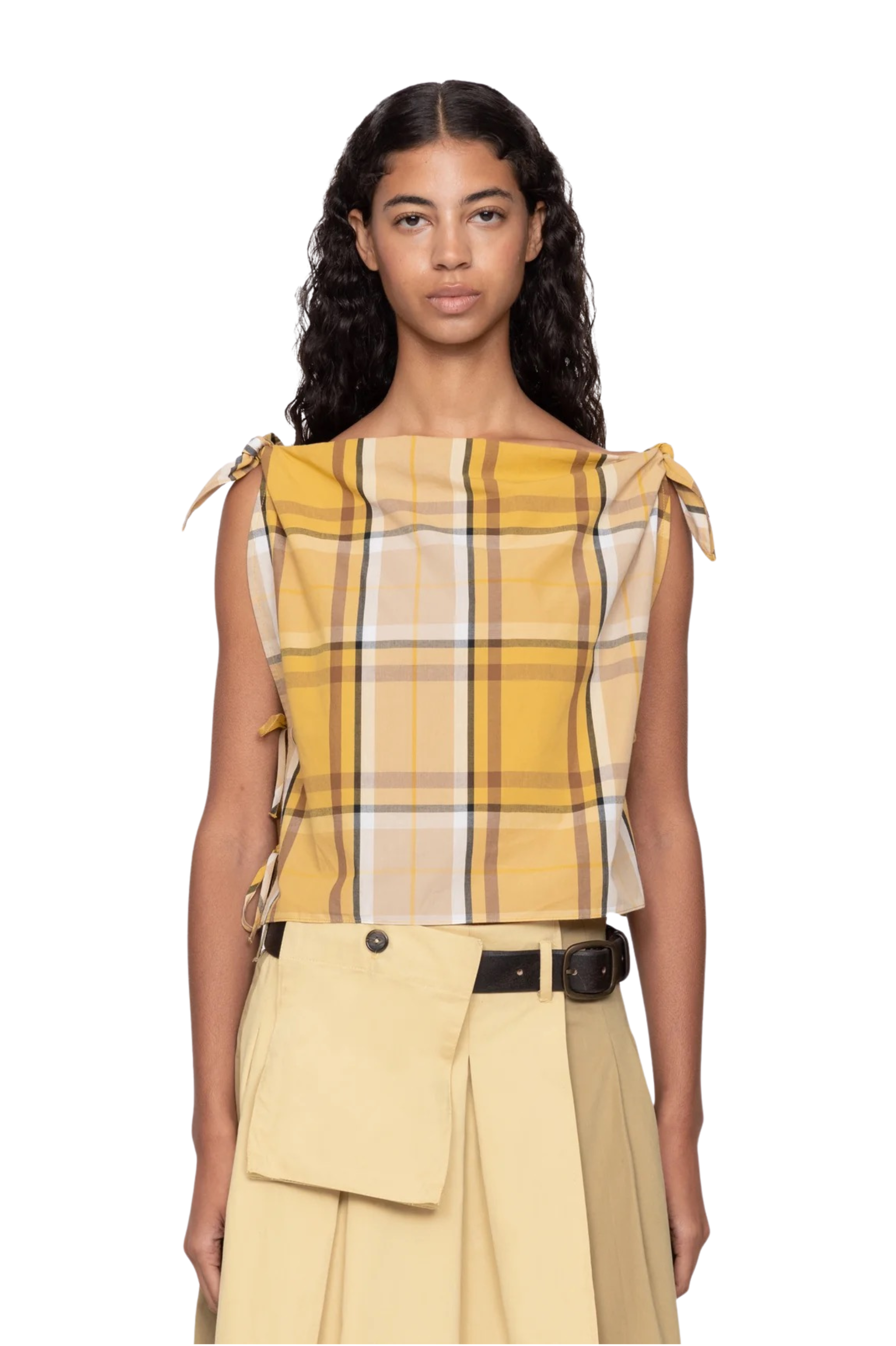 The Copeland plaid top features a relaxed, slightly cropped silhouette, with ties at the shoulders and sides for an easy, effortless finish.