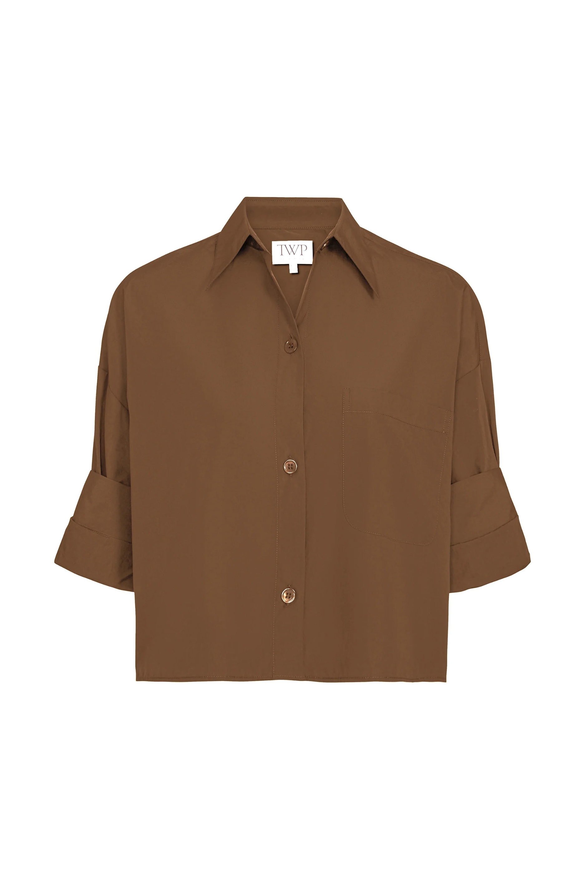 Cropped, short sleeved button down in cotton poplin. Boxy silhouette. Complete with a chest patch pocket, button up placket, spread collar, and a signature double roll button cuffs.
