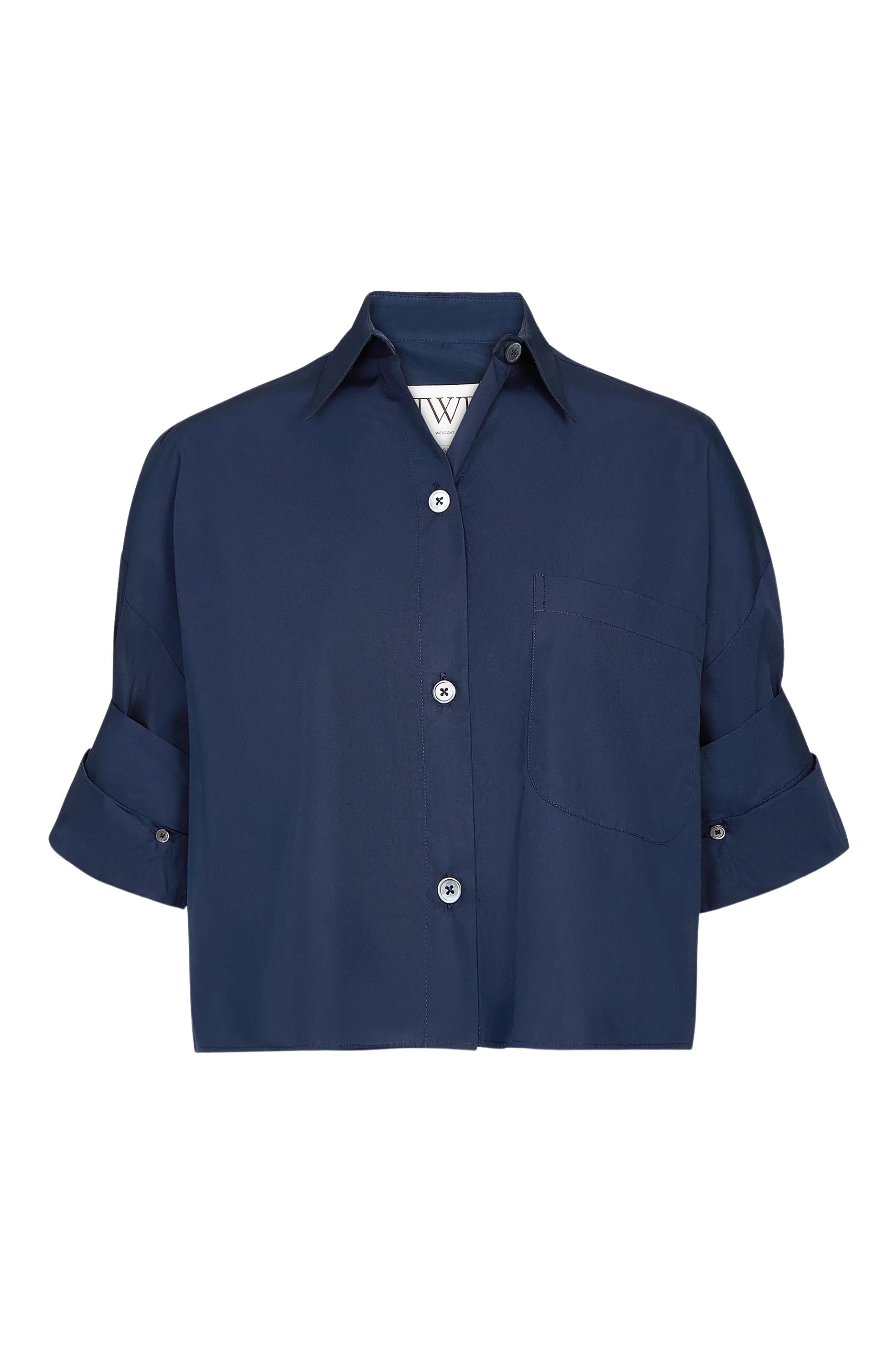 Cropped, short sleeved button down in superfine Italian cotton shirting. The Next Ex is a boxy silhouette. Complete with a chest patch pocket, button up placket, spread collar, and our signature double roll button cuffs.