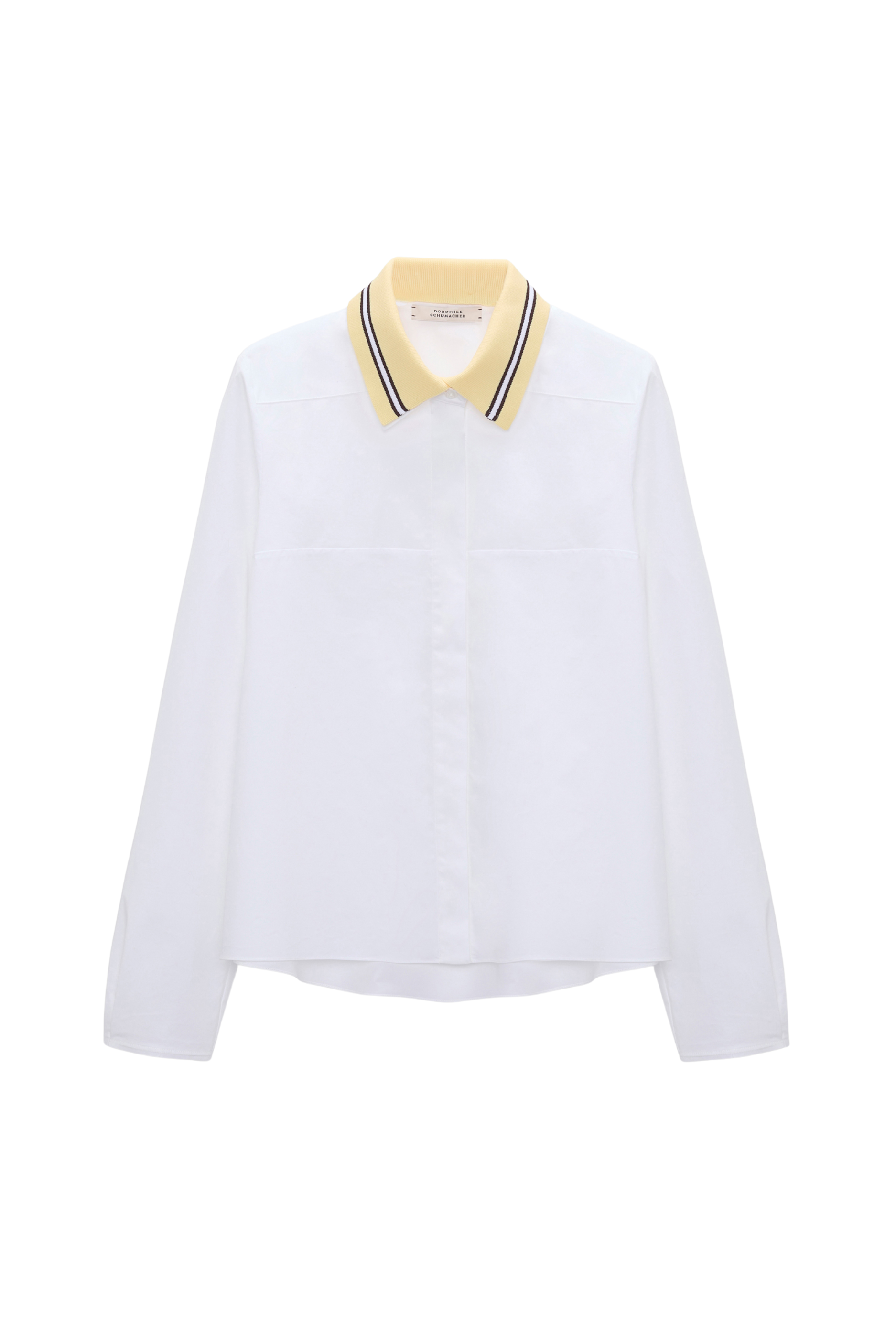 The cotton poplin shirt features a removable knit polo collar with contrast color striping. The shirt has an A-line silhouette.