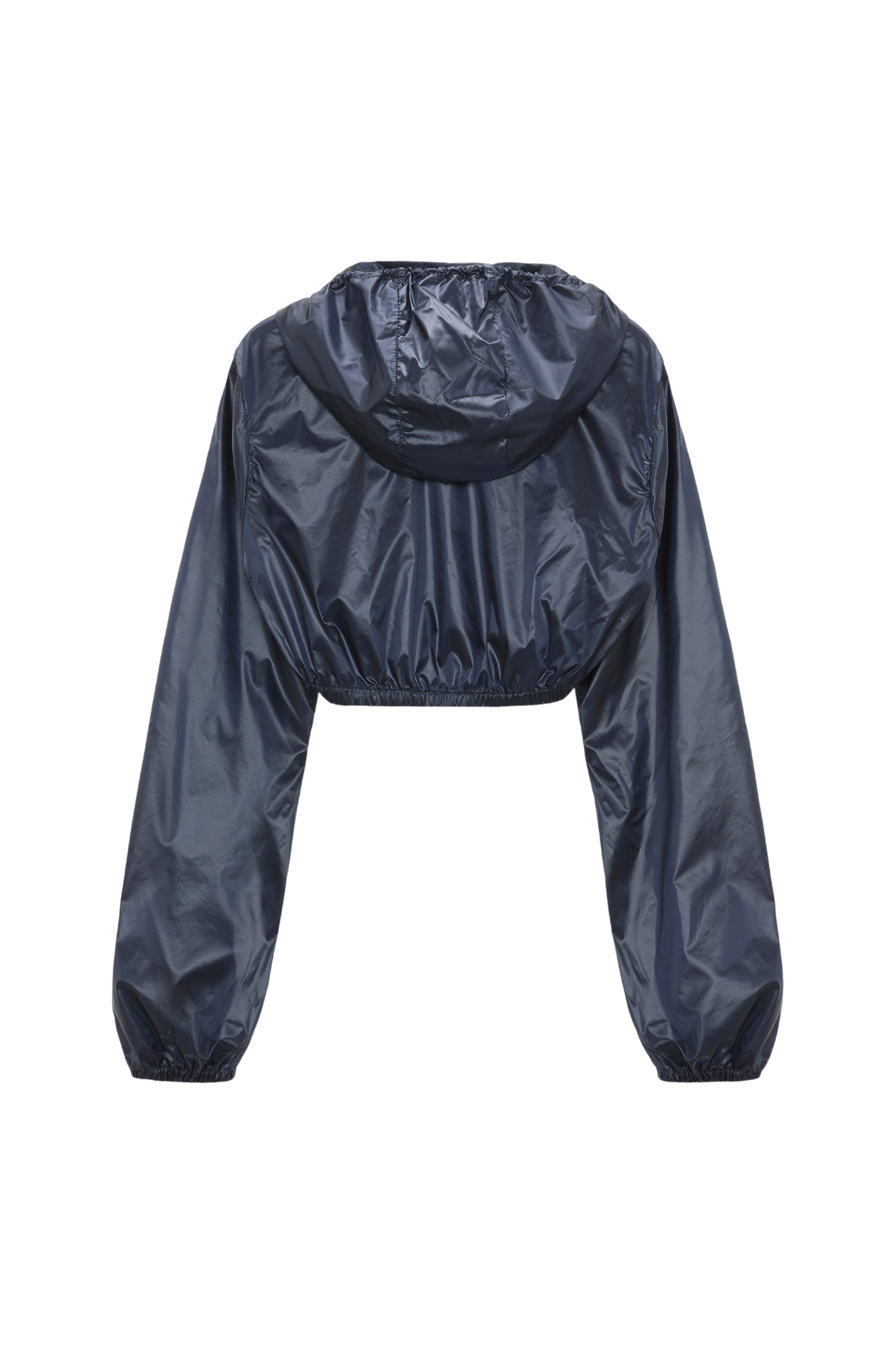 The sporty shrug is made from nylon and has a drawstring hood with signature hardware. The cropped silhouette is ideal for layering and has a ruffle-trimmed front panel.