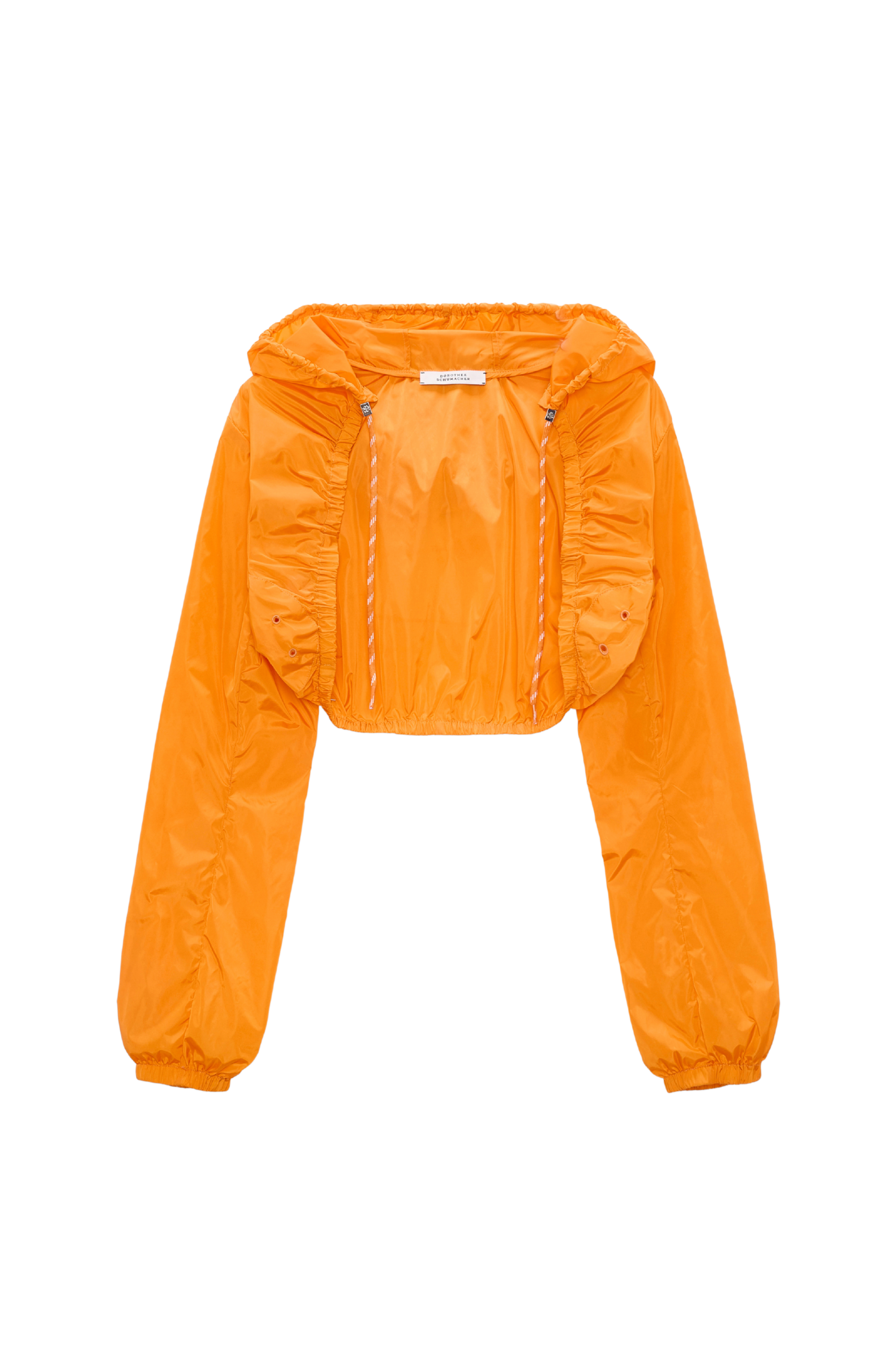 The sporty shrug is made from nylon and has a drawstring hood with signature hardware. The cropped silhouette is ideal for layering and has a ruffle-trimmed front panel.