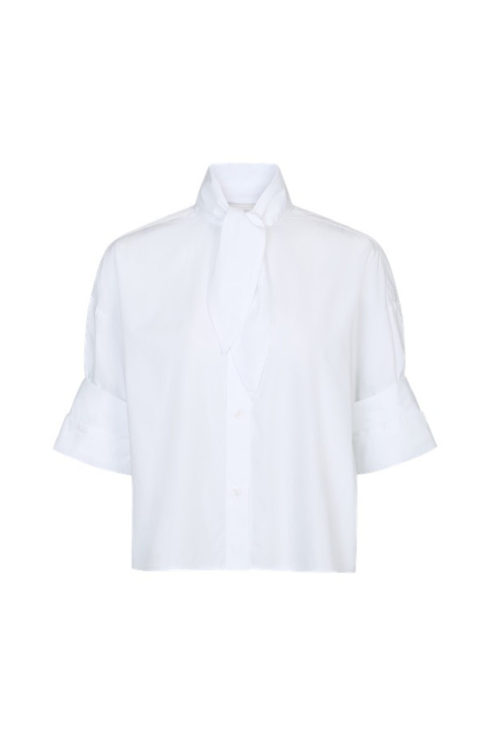 Cropped, short sleeved button down in superfine Italian cotton shirting, with a neck tie at the collar. The Tie One On Shirt is a cropped, boxy silhouette. Complete with a chest patch pocket, button up placket, spread collar, and our signature double roll button cuffs.