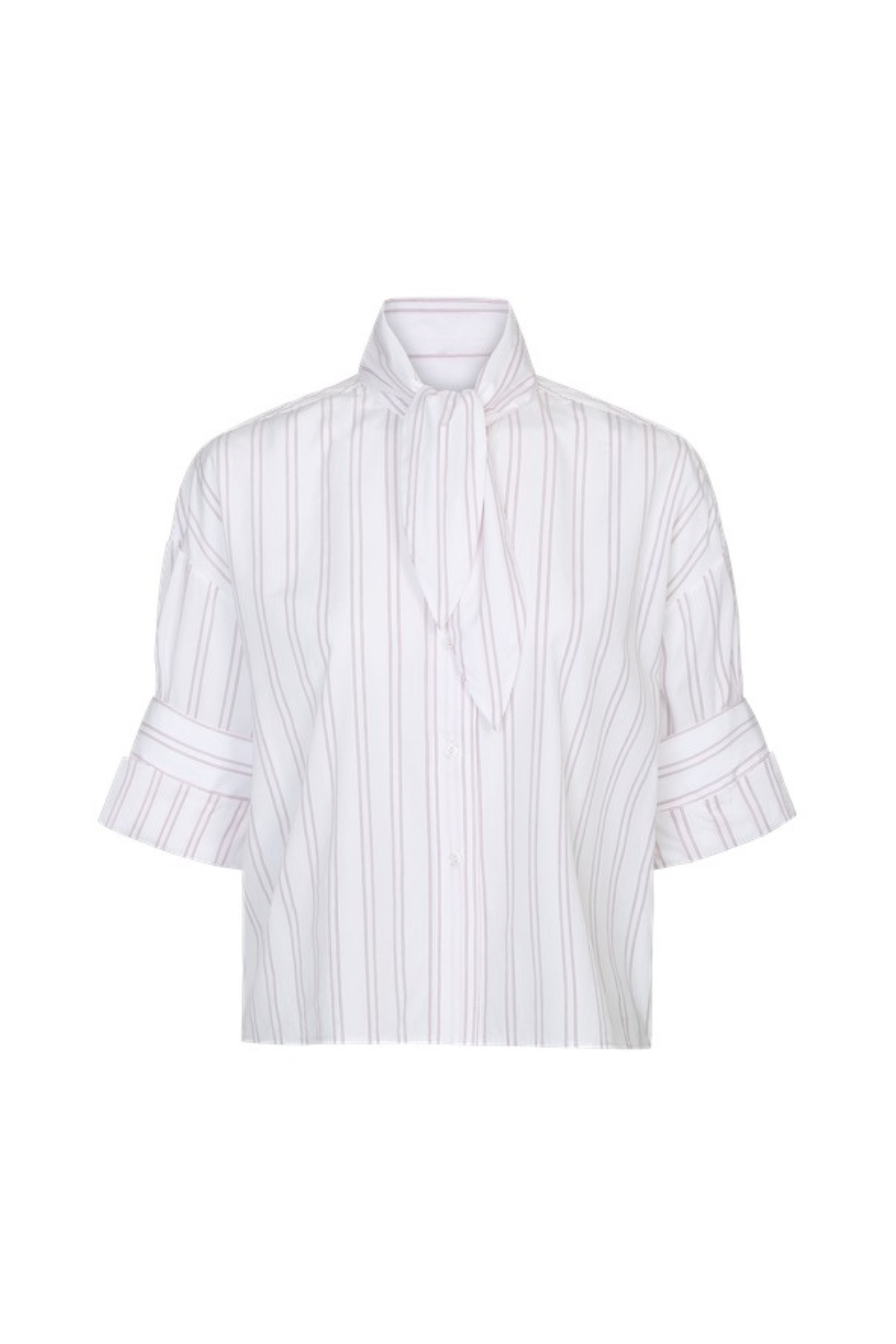 Cropped, short sleeved button down in superfine Italian cotton shirting, with a neck tie at the collar. The Tie One On Shirt is a cropped, boxy silhouette. Complete with a chest patch pocket, button up placket, spread collar, and our signature double roll button cuffs.