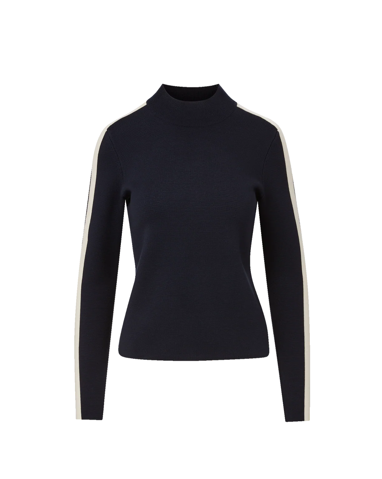 Sporty, yet refined. Crafted from a soft navy midweight knit, the Asante features a relaxed fit, mock neckline, and long sleeves finished with contrast track-inspired white stripes. Style with the matching Jenkins pant for a modern, coordinated look—or tuck into relaxed denim for off-duty cool.